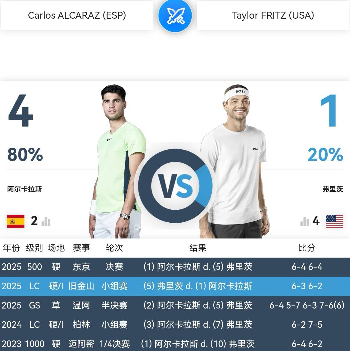 This season, they played three times. After Alcaraz’s 3-1 win in the Wimbledon semifinals, Fritz expressed frustration, saying in the post-match press conference, "I’d rather face Sinner than Alcaraz." Surprisingly, at the Laver Cup exhibition, Fritz swept Alcaraz in two sets, helping Team World win the title. Soon after, at the ATP 500 Tokyo final, an injured Alcaraz bounced back to beat Fritz in straight sets, leaving Fritz embarrassed. When they meet in the group stage, Alcaraz is clearly the favorite.