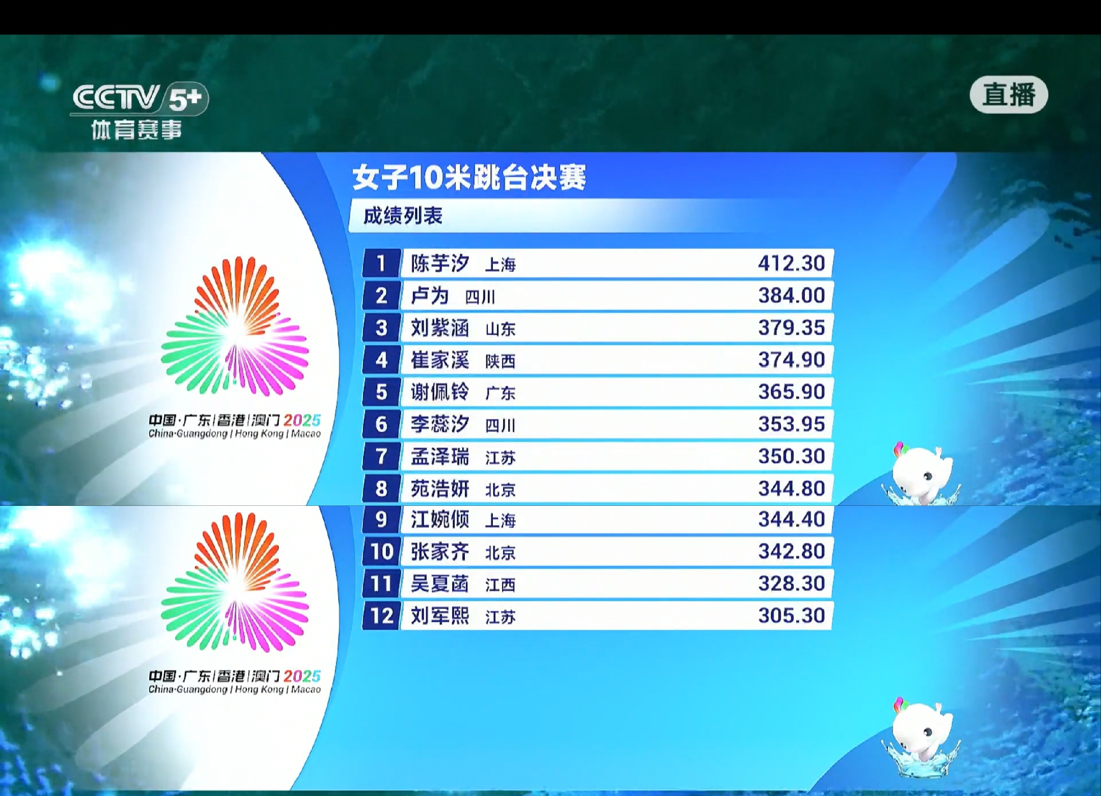 The latest news from the Women's 10m platform diving at the National Games: Chen Yuxi took the gold medal, Lu Wei won silver, Liu Zihan got bronze, and Zhang Jiaqi ended up in tenth position in the final just finished.