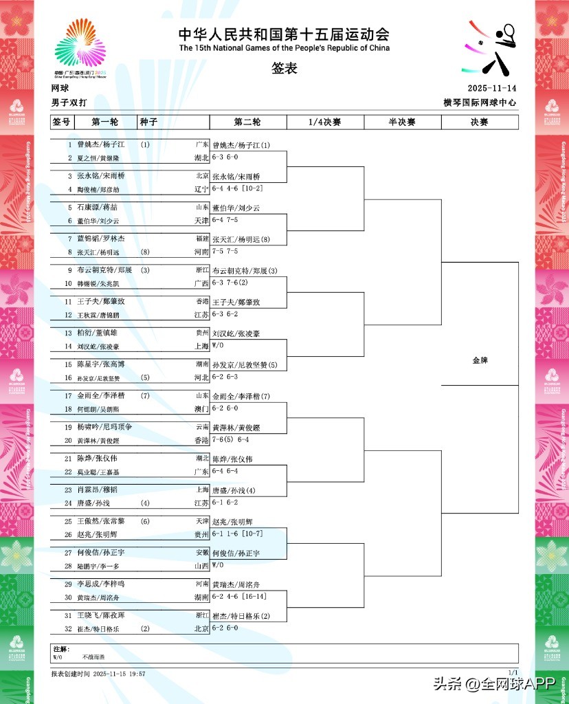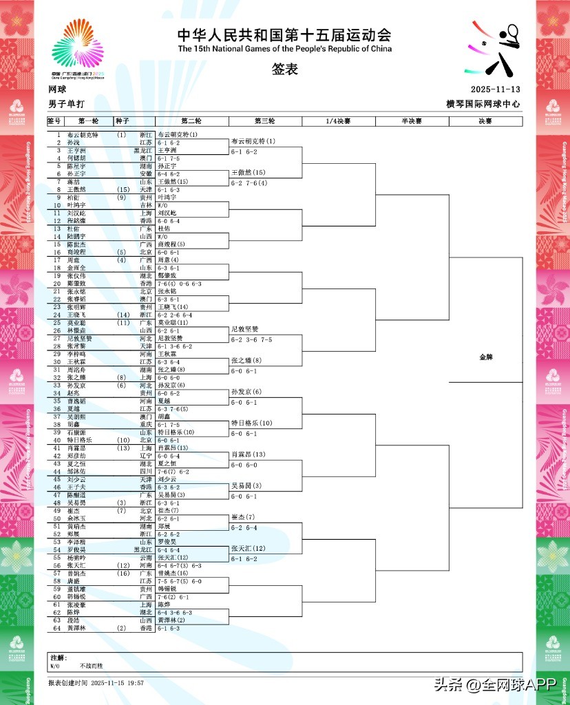 In other men's singles matches, top seeds including No. 1 Buyun Chaokete, No. 6 Sun Fajing, No. 7 Cui Jie, and No. 8 Zhang Zhizhen all advanced to the round of 16. The host province Guangdong’s No. 11 seed Mo Yecai lost 1-2 in sets to Hebei player Ni Dunjianzhan, missing out on the men’s singles last 16.
