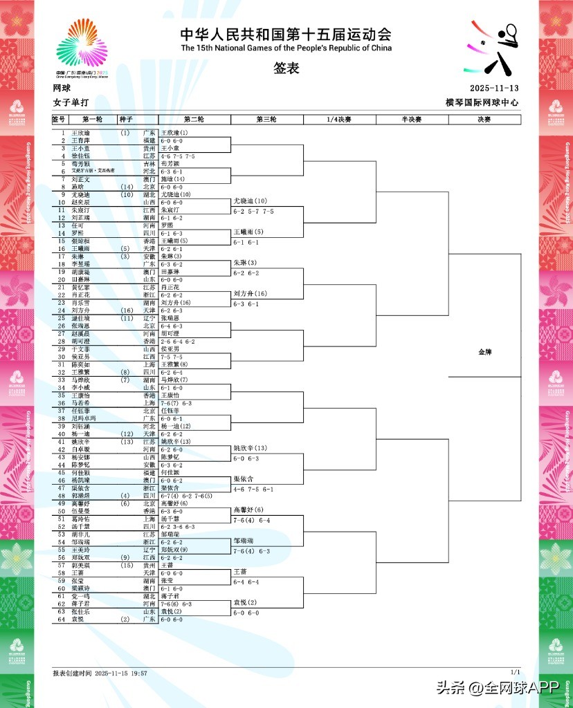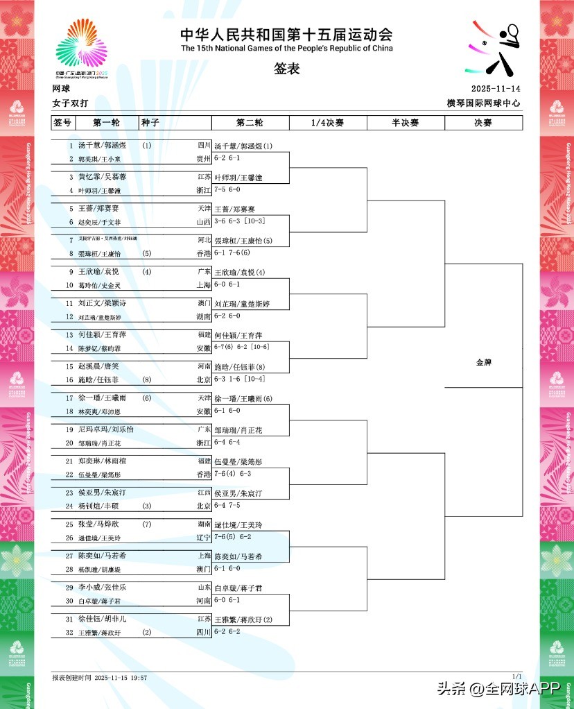 On November 16th, the tennis events at the 15th National Games will continue with the second round of singles. Huang Zelin, Wang Xinyu, and Shang Juncheng will appear on center court, while Zhou Yi and Wang Yafan will compete on Court 1. Additionally, the second round of doubles matches will fully commence, featuring high-seeded pairs such as Wang Xinyu/Yuan Yue, Wang Yafan/Jiang Xinyu, Zeng Yaojie/Yang Zijang, and Cui Jie/Terigele.