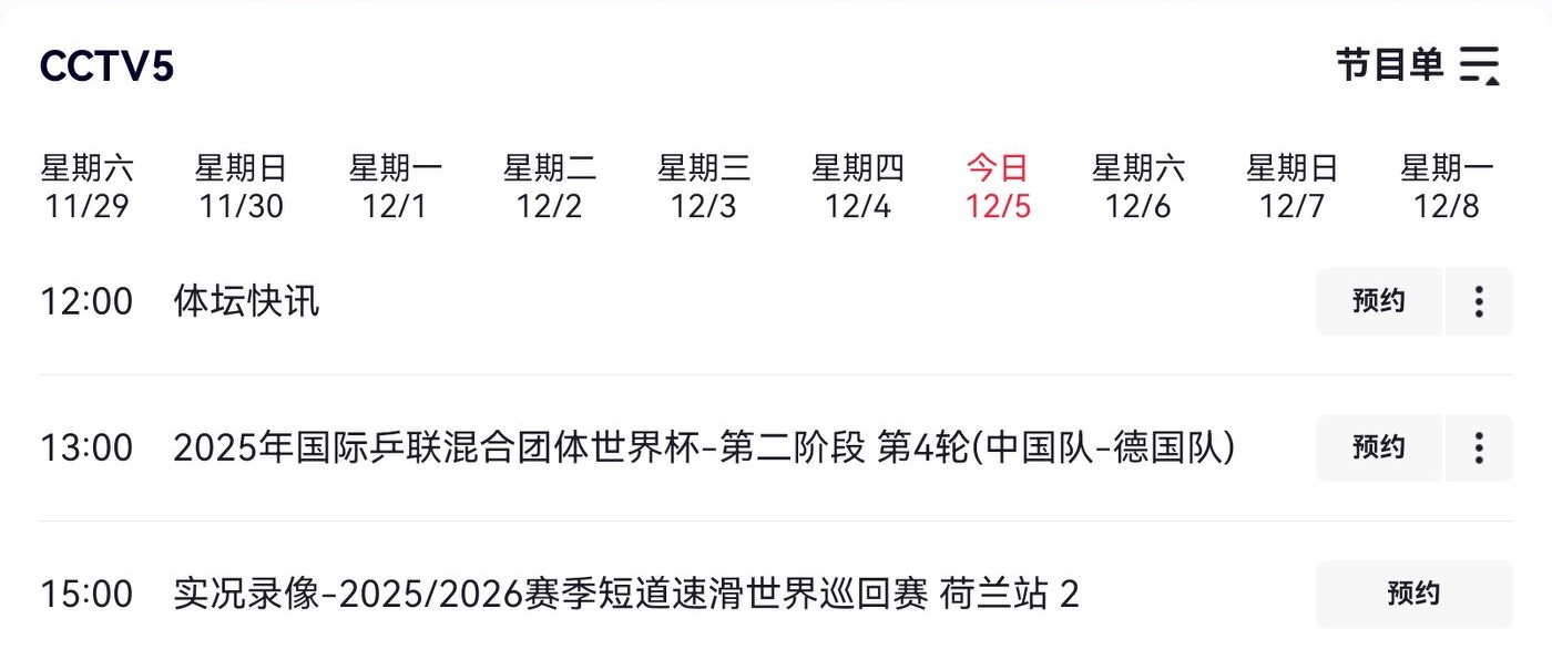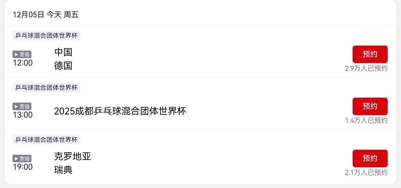 The Table Tennis Mixed Team World Cup match today (2025.12.5) is China vs. Germany, live on CCTV-5 and Yangshipin.