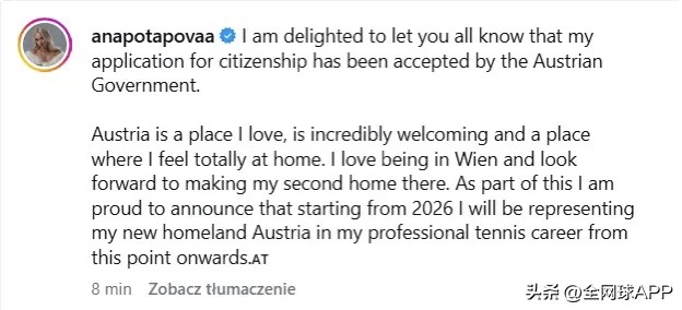 "I am very happy to share this news with you all. My permanent residency application has been approved by the Austrian government. Austria is a country I love deeply; the people here are incredibly warm and welcoming, making me feel right at home. I really enjoy Vienna and look forward to it becoming my second home. I proudly announce that starting in 2026, I will begin my professional tennis career representing my new homeland, Austria," Potapova stated on her personal social media.