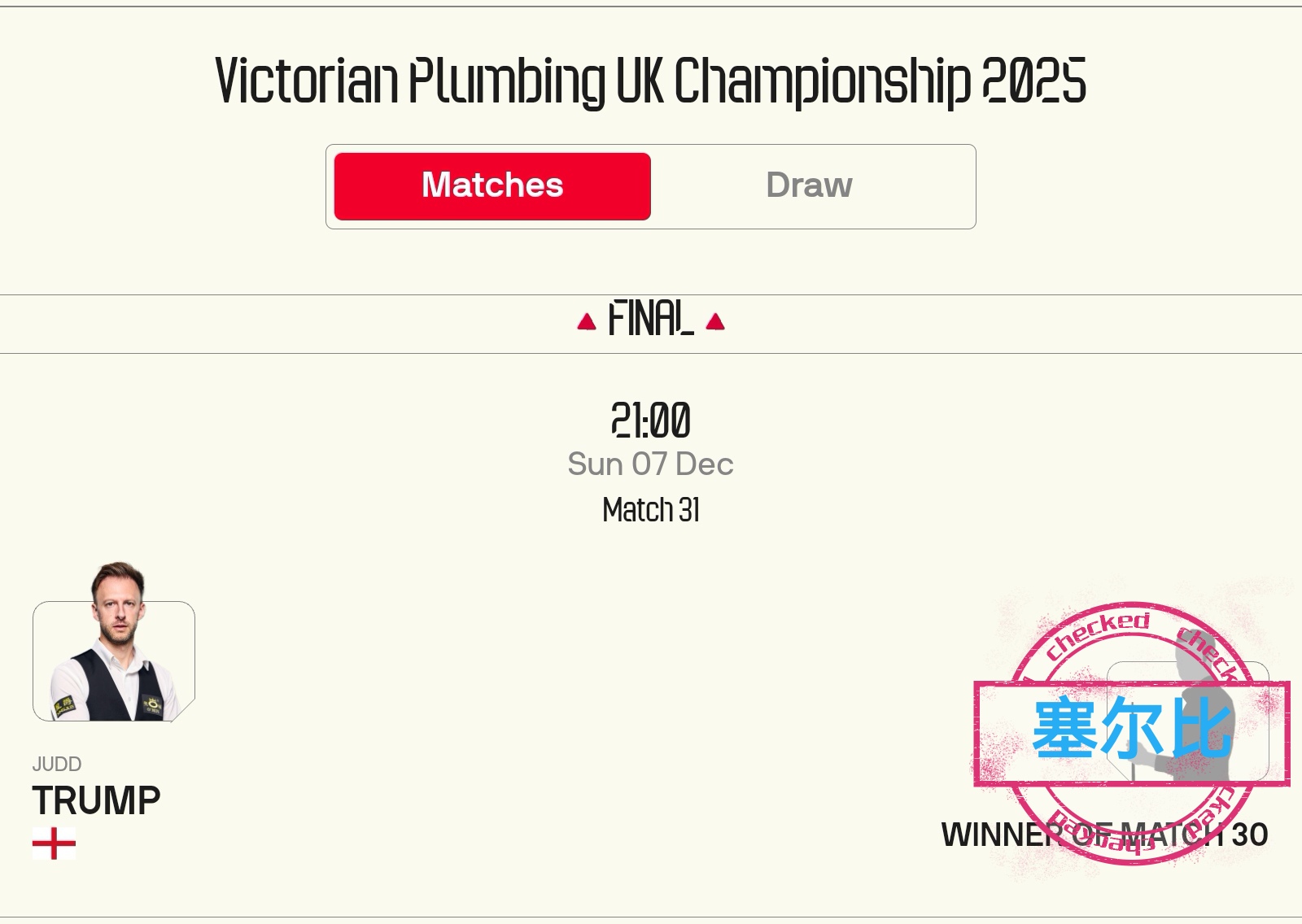 The Snooker UK Championship final today (2025.12.7) pits Trump against Selby, live on CCTV-5+, Yangshipin, and Huya.