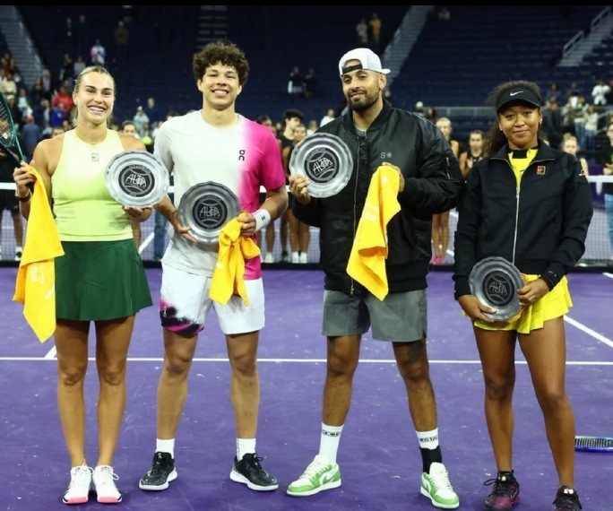Let's turn to an exhibition match. Yesterday, Beijing time, the "Atlanta Cup" tennis exhibition took place as scheduled at the South Atlanta Arena. In the singles matches, world number one Sabalenka defeated Japanese star Osaka Naomi, and America's second-ranked player Shelton beat Australia's troublemaker Kyrgios. In the mixed doubles exhibition, Sabalenka teamed up with Shelton to claim victory.