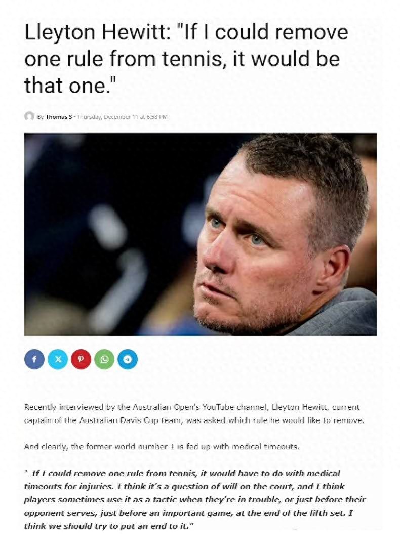 Australian tennis great Hewitt recently expressed bluntly in an official Australian Open interview that the medical timeout rule in tennis should be abolished.