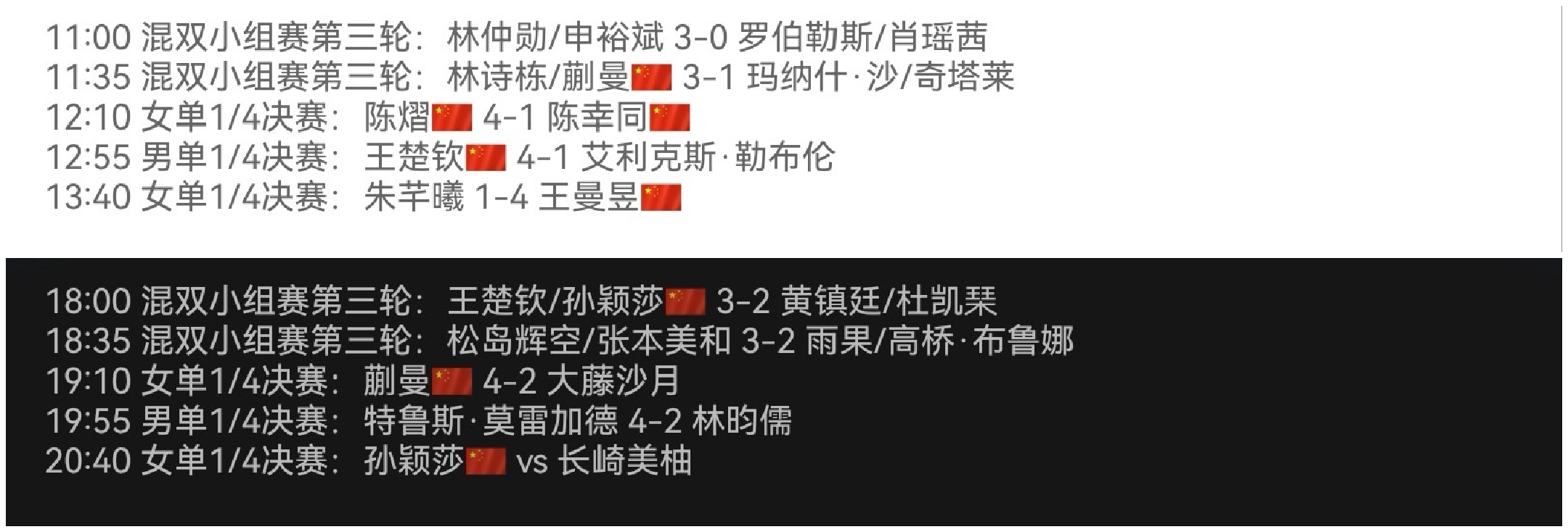 All match results for Chinese players today are shown in the following chart.