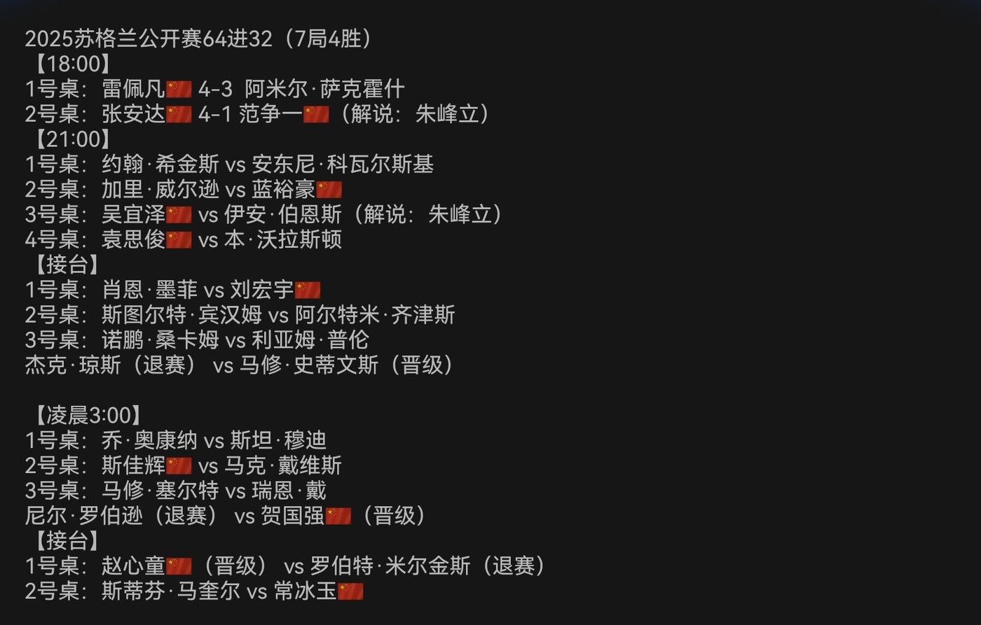 Latest updates from the Snooker Scottish Open: Zhao Xintong, Zhang Anda, He Guoqiang, and Lei Peifan won their matches, while Fan Zhengyi lost and was knocked out. The schedule for tonight (2025.12.15) is included.
