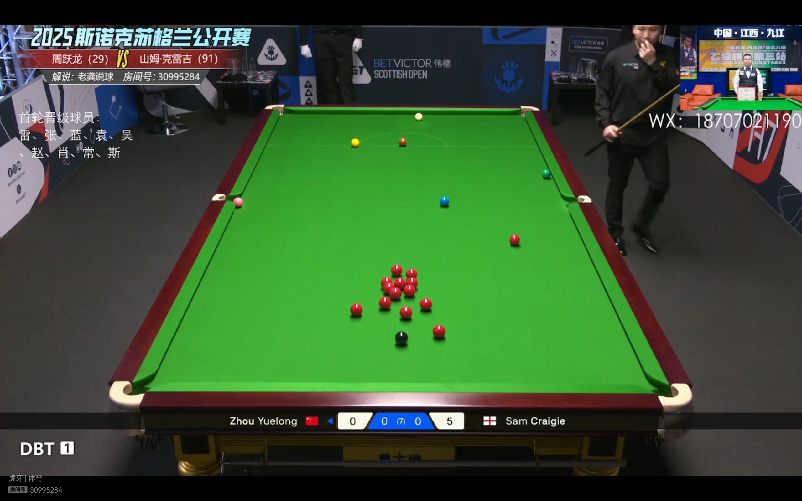 At the moment, the match between Zhou Yuelong and Craigie is in its first frame, with the overall score tied at 0-0.