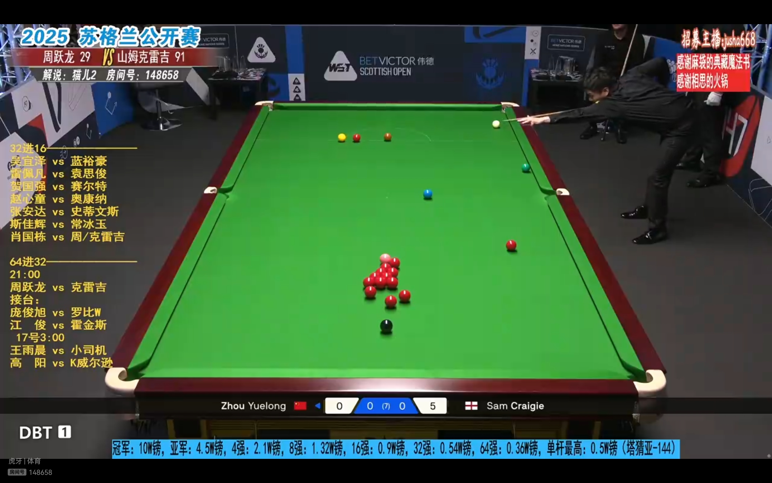 The Huya streaming platform and Migu Video are currently airing the Snooker Scottish Open match between Zhou Yuelong and Craigie, while Xiao Guodong has already won and progressed to the next round.
