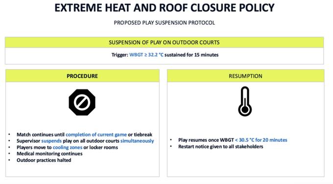 Matches will pause after the current game or tiebreak finishes, with players directed to cooling zones or locker rooms while medical monitoring continues and outdoor training suspends as well. Play will only resume once the WBGT has stayed below 30.5°C for at least 20 continuous minutes and official confirmation is received.