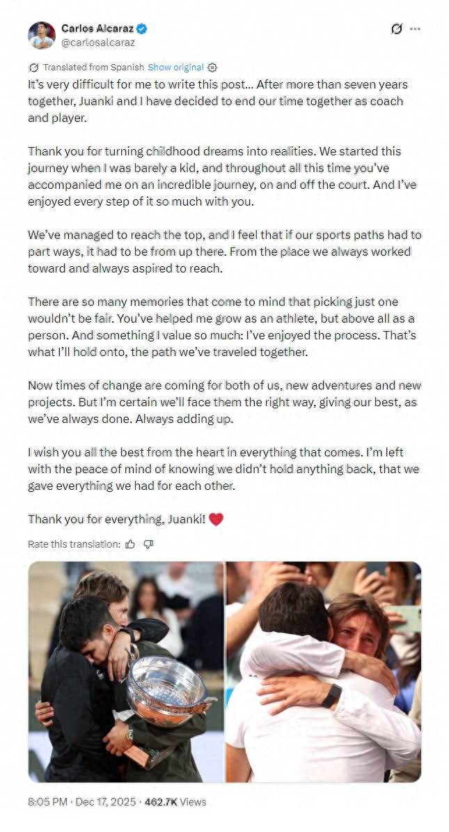 Recently, current world number one Alcaraz suddenly announced via social media the end of his seven-year partnership with his coach, causing an immediate uproar in the public.