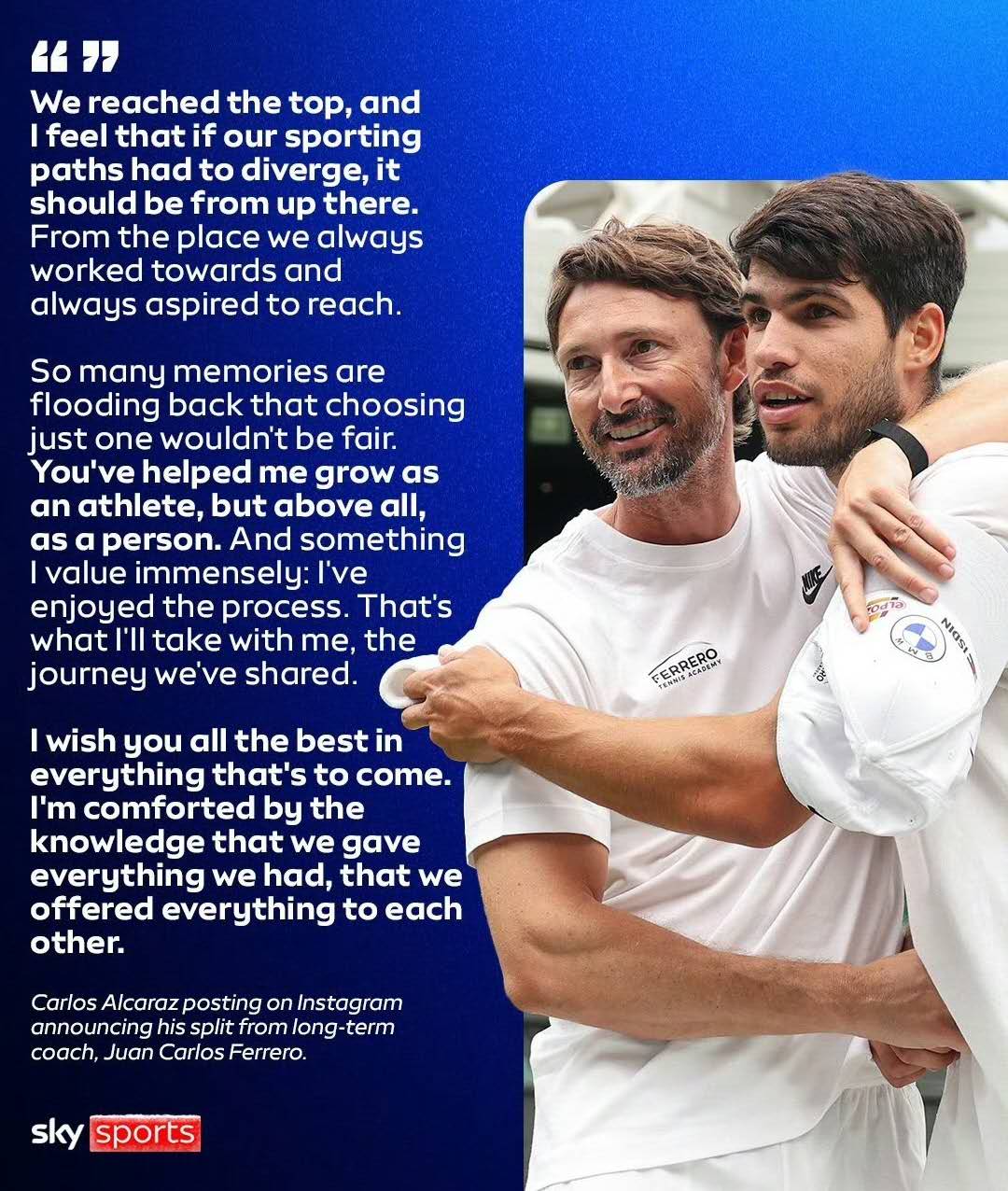 This theory originates from analyzing Alcaraz’s split statement, where he said, “After a journey of seven years together, Juan (Ferrero) and I have decided to end the player-coach relationship. We reached the pinnacle of success together. I believe if we must part ways in our sporting journey, it should be from this high point we have worked so hard to achieve.”