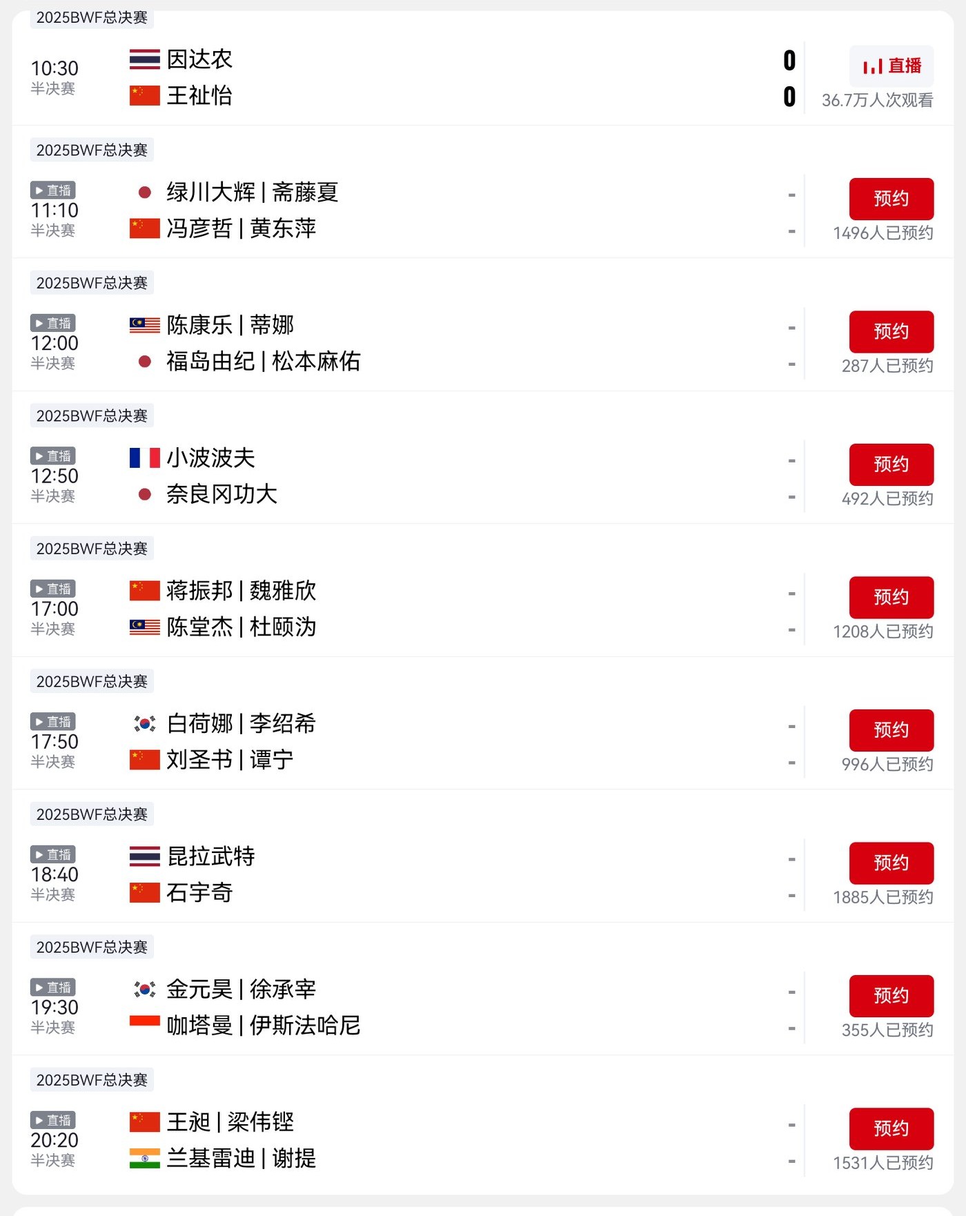 Yangshipin is live streaming the women's singles semifinal of the badminton finals featuring Wang Zhiyi versus Intanon. Also, attached is today's (2025.12.20) schedule.