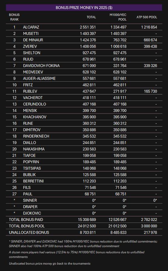 Originally, Alcaraz was eligible for a $4.8 million bonus for leading in points, but he missed two Masters 1000 tournaments—the Canadian Open and Shanghai Masters—resulting in a $3 million deduction. This cut lowered his season total to $18.8 million. Had he played more Masters events, his total earnings could have been much higher. Meanwhile, Musetti emerged as the biggest winner in Masters prize money.