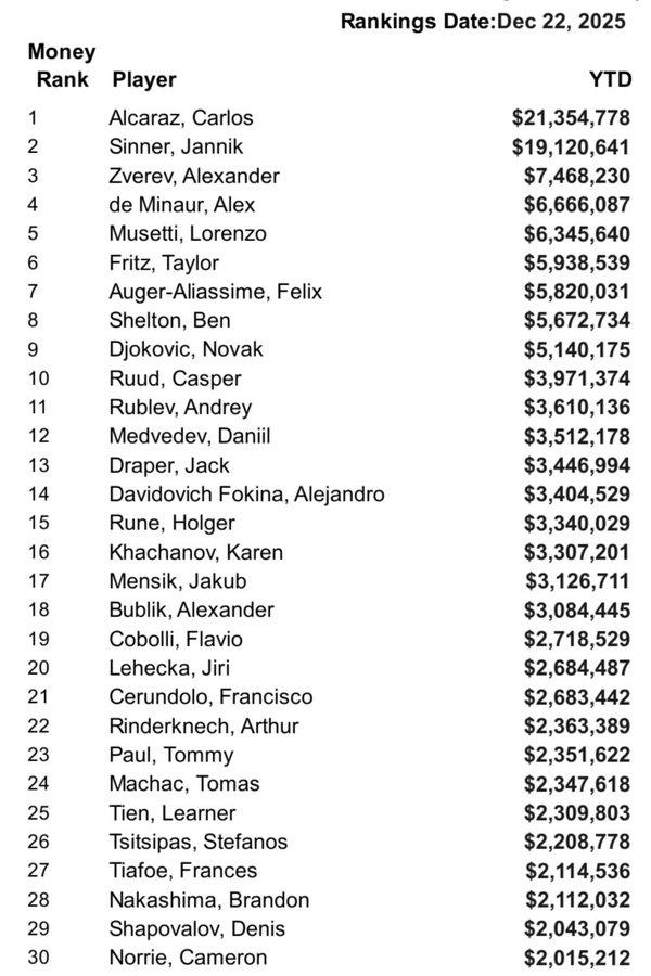 According to an ATP report, Alcaraz earned $21,354,778 in prize money during 2025, topping all male players and highlighting his dominant form this season.