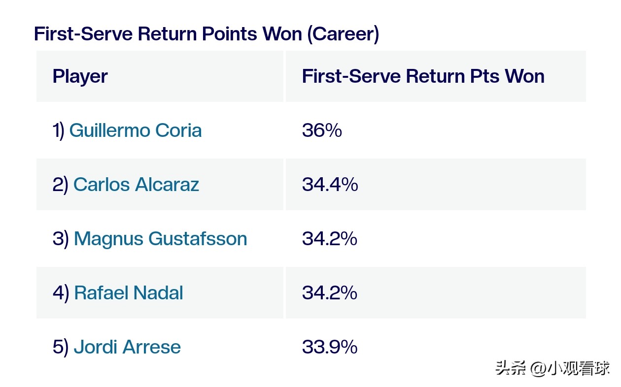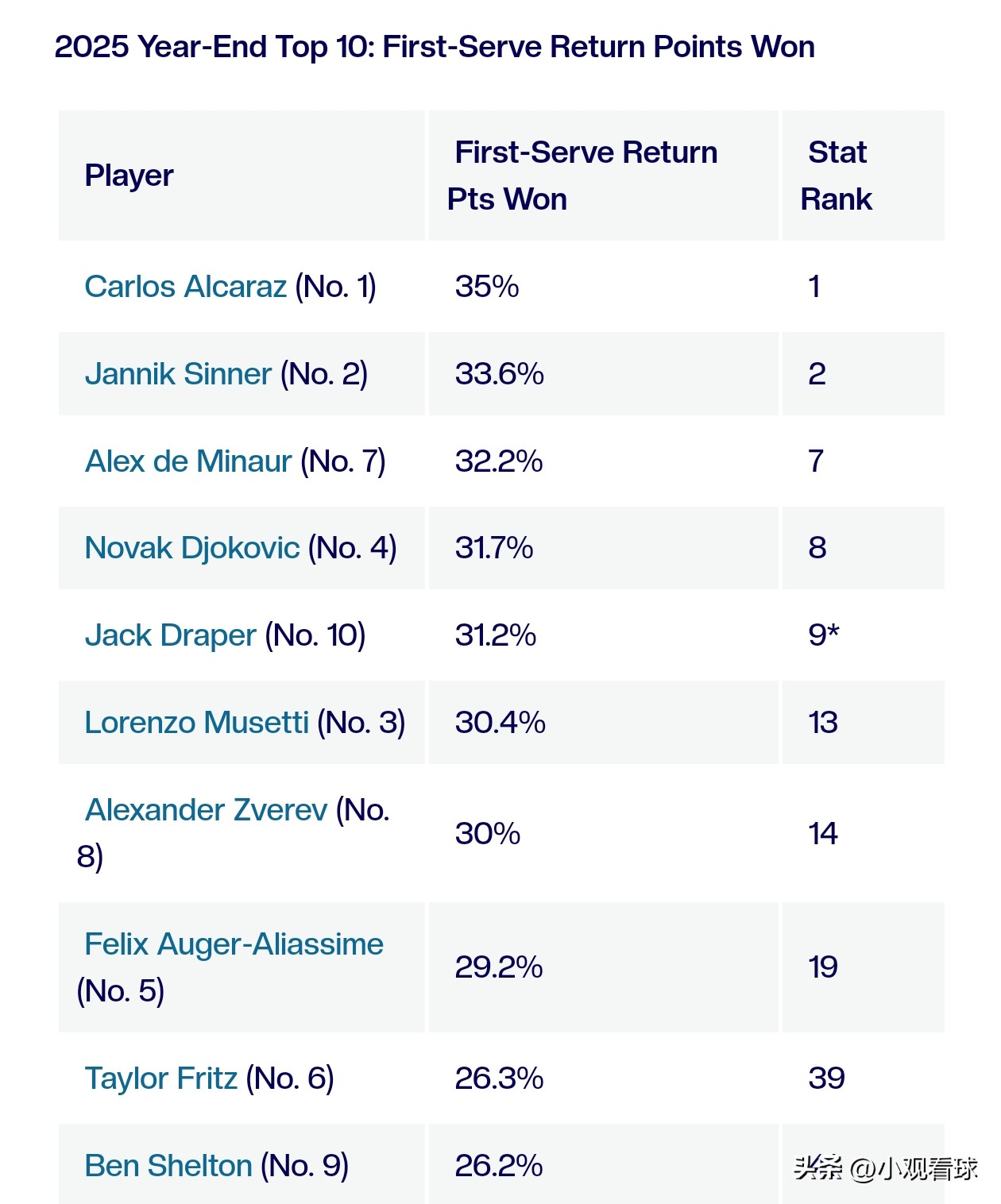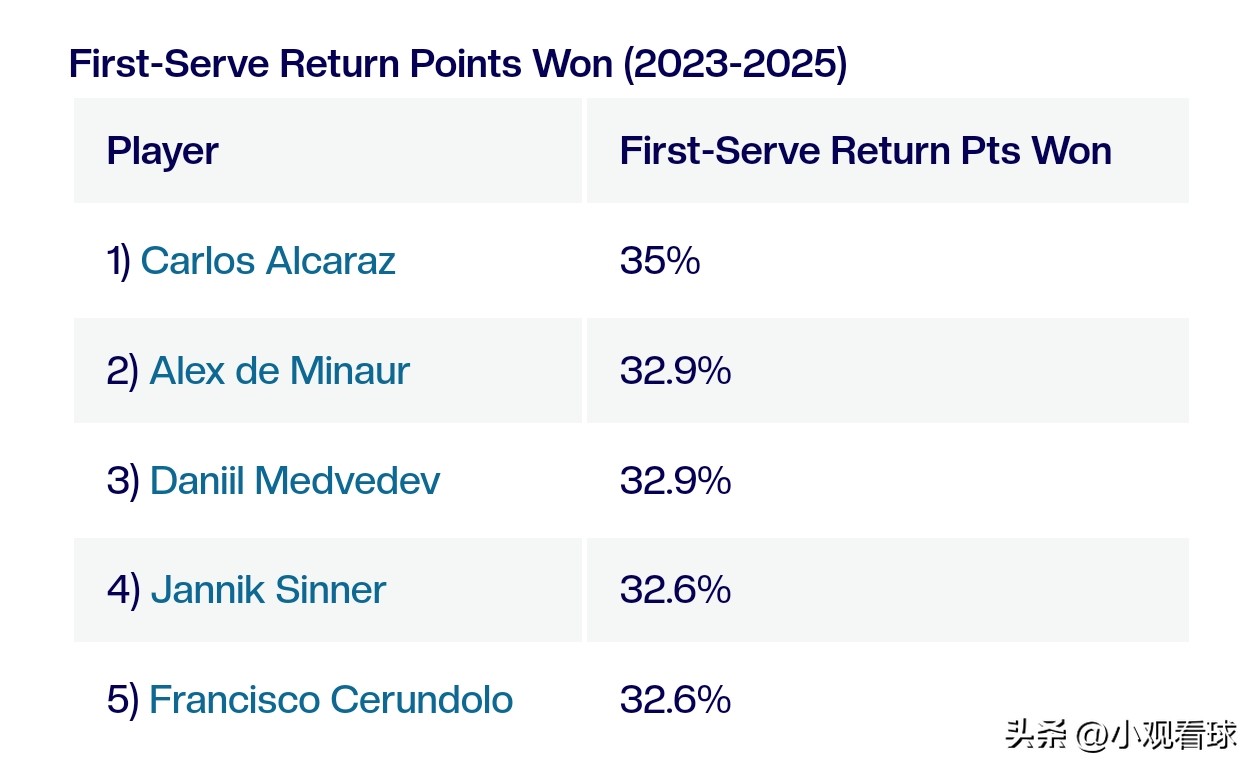 It is well known that the first serve is a critical weapon for ATP Tour players, with most relying on high-quality serves to immediately pressure opponents and win many direct points. Even for a player as strong as Alcaraz, winning just over one-third of return points highlights the exceptional value of his lead in this statistic. At 22 years old, his 35% return points won rate in 2025 stands out distinctly among the year-end top ten, with seven of the other nine players trailing by at least 10 percentage points.
