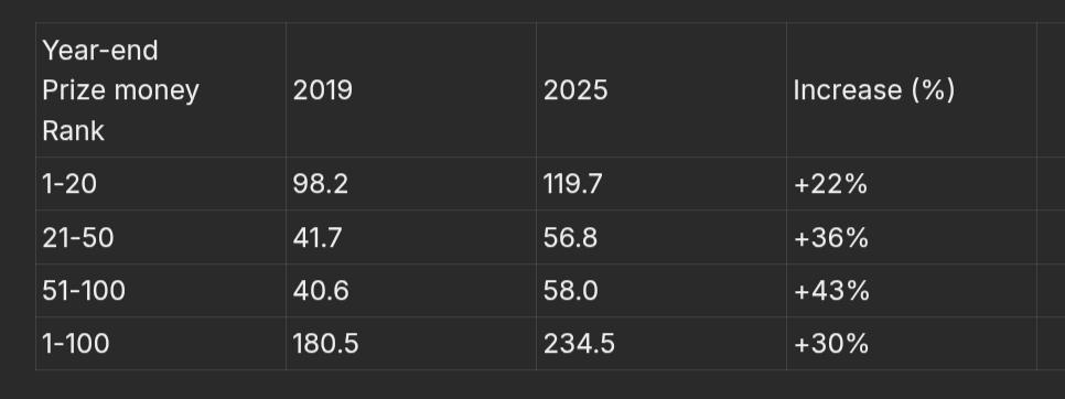 The situation is different for lower-ranked players. Those ranked 21 to 50 saw their earnings increase by 36%, while players ranked 51 to 100 experienced a 43% rise. These groups have outpaced inflation, earning more in 2025 than they did six years ago.