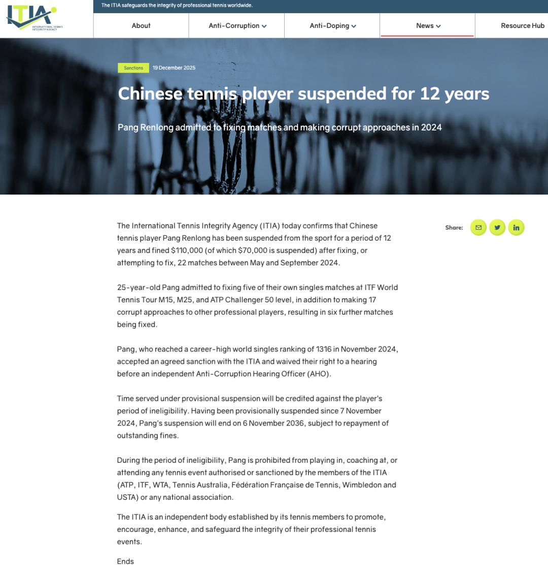 It was anticipated that after Pang Renlong’s 12-year ban by the International Tennis Integrity Agency for match-fixing in 22 games, the matter’s heat would subside slowly; unexpectedly, with his new harsher sanctions, the spotlight has intensified once more.