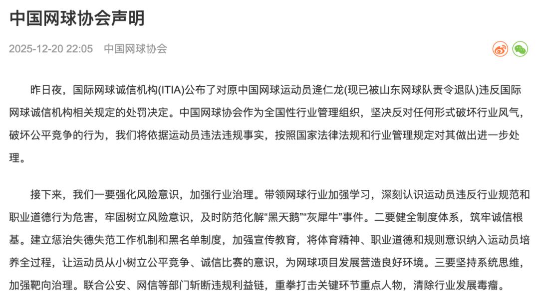 After the International Tennis Integrity Agency’s announcement about Pang Renlong, the Chinese Tennis Association promptly issued a statement affirming they would neither cover up nor protect him. This led some fans and netizens to openly suggest that further punishments might be on the way, and a 12-year ban might not be the final penalty.
