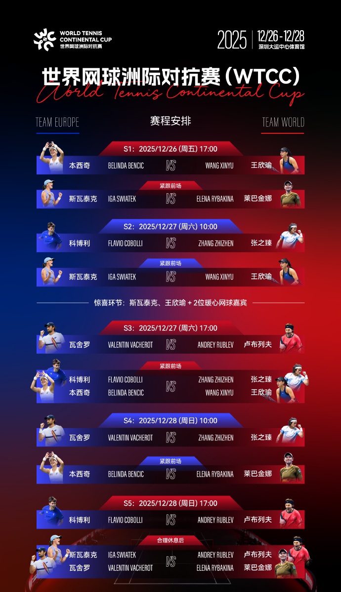 Now, let’s look at an exhibition match. At 5 PM Beijing time today, the World Tennis Continental Challenge (WTCC) will begin at Shenzhen Universiade Center Gymnasium. Stars like Poland’s Swiatek, Kazakhstan’s Rybakina, Switzerland’s Bencic, Russia’s Rublev, Italy’s Cobolli, Monaco’s Vacherot, along with Chinese players Zhang Zhizhen and Wang Xinyu, will deliver an exciting year-end tennis feast for fans.