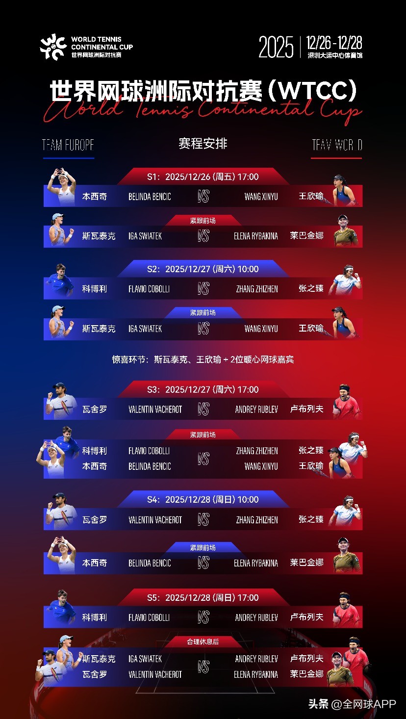 The inaugural WTCC spans three days, dividing the eight tennis stars into the World Team and the Europe Team. They will compete across five stages featuring 10 matches in men’s singles, women’s singles, and mixed doubles. The pioneering “Europe vs. World” format offers an intense schedule and high competitive intensity rarely seen in exhibition tennis, enhancing strategic depth and team spirit while allowing fans to witness players from diverse styles and backgrounds battle on the same court.