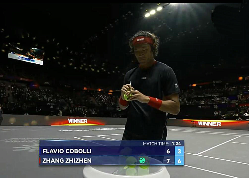 In the third match that ended around noon Beijing time today, World Team’s Zhang Zhizhen battled Europe’s Kobori for 1 hour and 24 minutes, winning 7-6, 6-3, and securing the first point for the World Team.