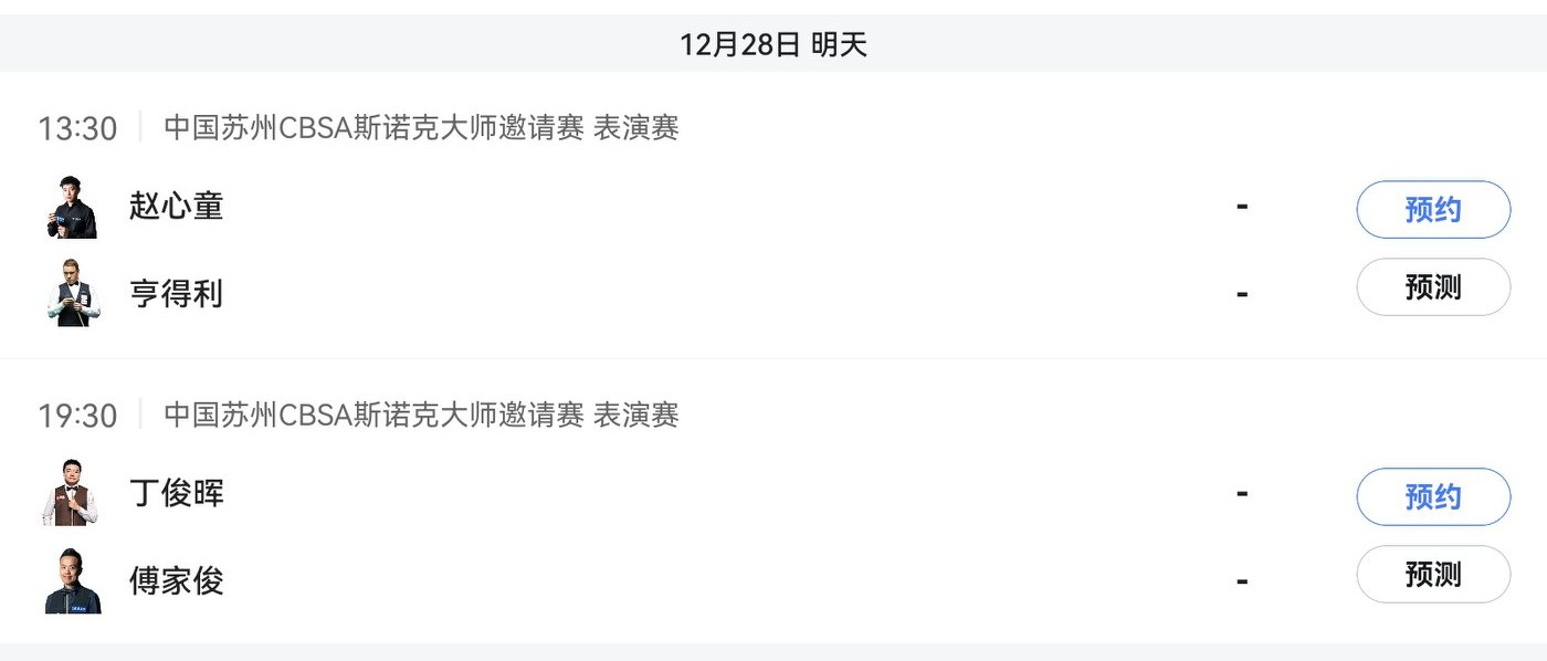 The Snooker Suzhou Masters Invitational on December 28, 2025, includes competitors such as Zhao Xintong, Hendry, and Ding Junhui, with live coverage on Migu Video and Huya.