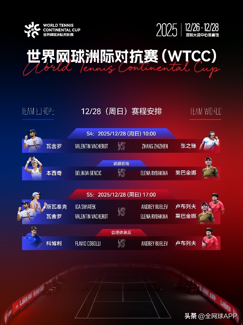 With stages S2 and S3 concluded, Team World leads Team Europe 6-4 heading into the final day. The narrow 2-point margin keeps the contest suspenseful. The remaining two stages will kick off on December 28: stage S4 opens with Vacherot versus Zhang Zhizhen, followed by a high-level clash between Bencic and Rybakina; stage S5 starts with mixed doubles featuring Swiatek/Vacherot against Rybakina/Rublev, and the men’s singles final between Cobolli and Rublev will decide the championship.