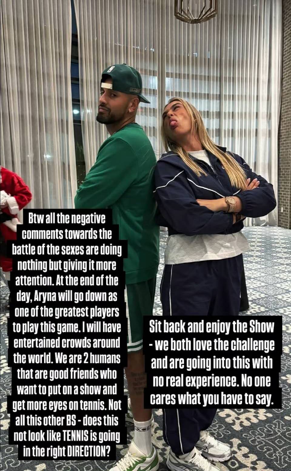 Facing a flood of criticism, Kyrgios responded by calling Sabalenka "one of the greatest players in tennis history" and emphasized their friendship. He said the event was simply to deliver an exciting show together and attract more attention to tennis. They love challenges and don’t care about outside opinions.