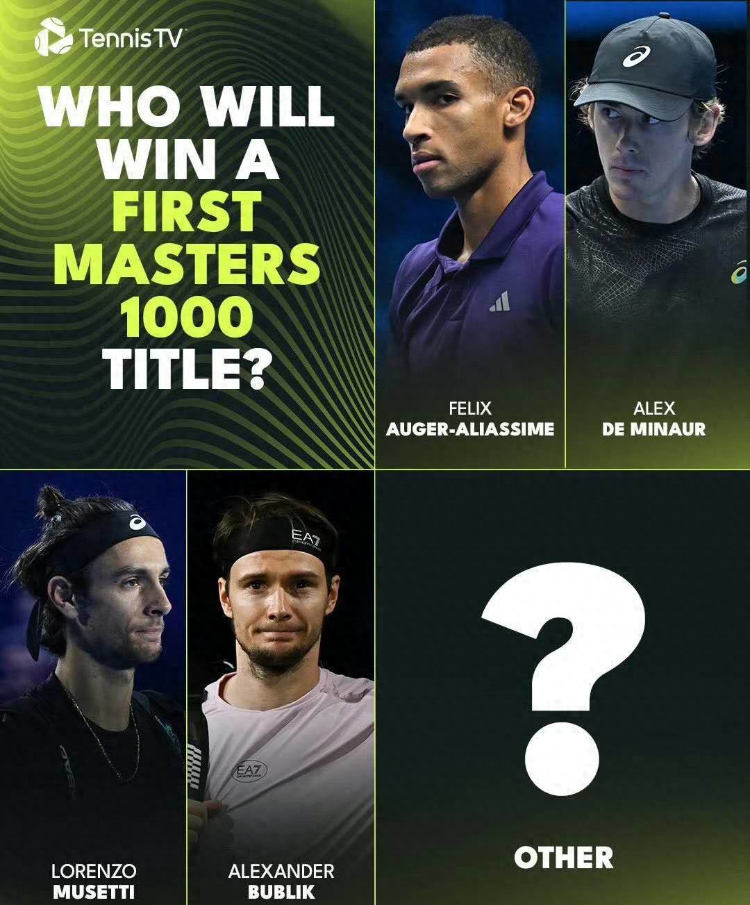 This year, four new Masters champions emerged: Draper, Shelton, Menchik, and Ruud. Musetti reached a Masters final for the first time, and Aliassime made it for the second time, making both strong contenders in this category next season.