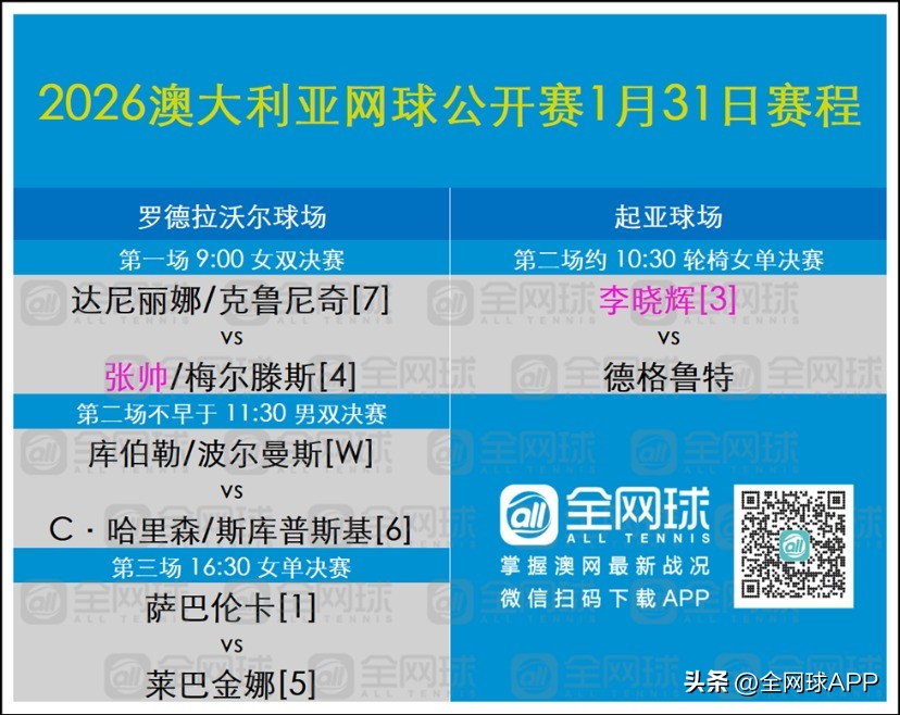 On the Rod Laver Arena schedule, the women's doubles final between the 4th seeds Zhang Shuai / Mertens and the 7th seeds Danilina / Krunic will commence promptly at 9 AM Beijing time on January 31. The men's doubles final will follow, with the title contested between the home wildcard pair Kubler / Polmans and the 6th seeds Harris / Skupski.
