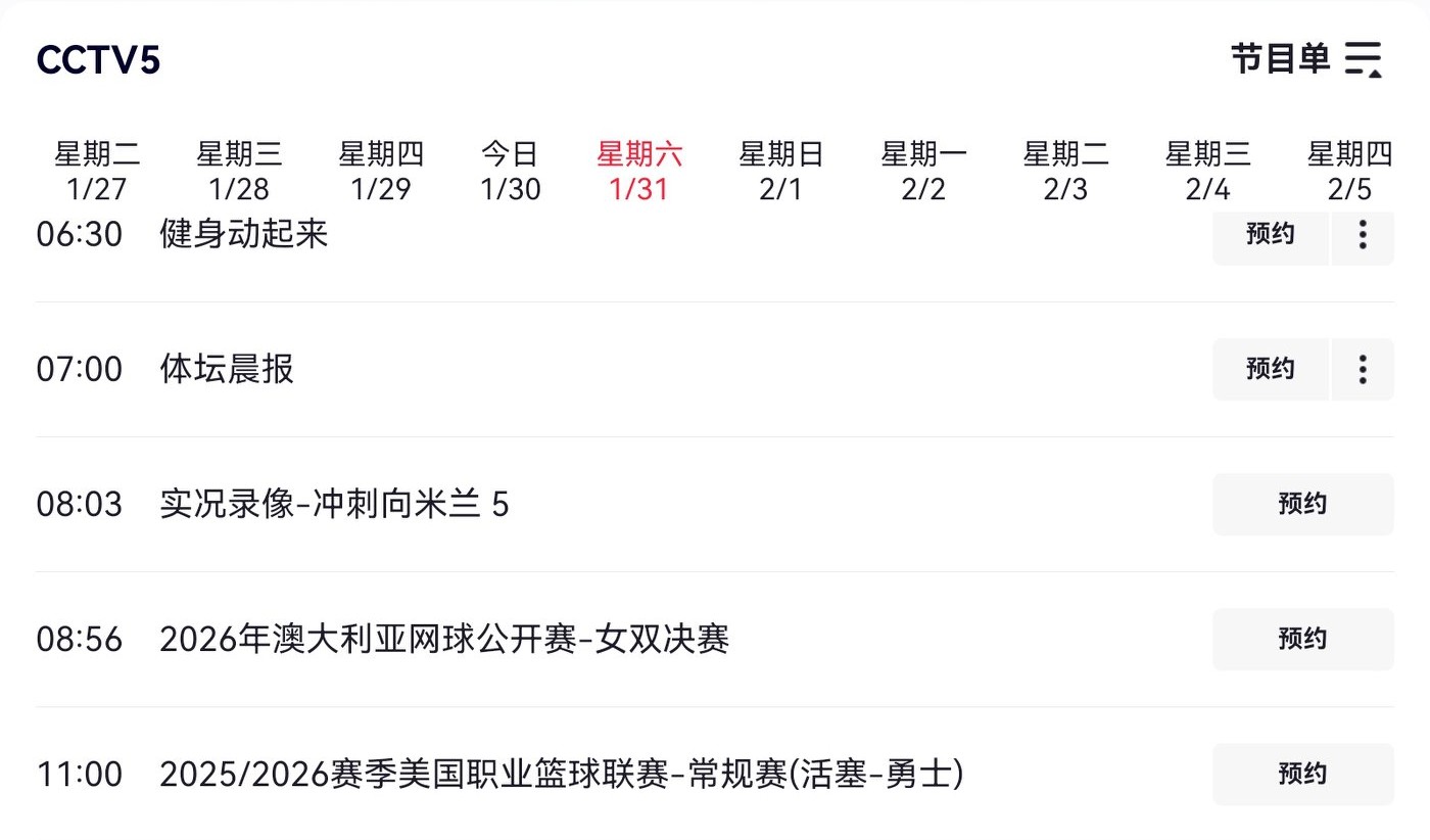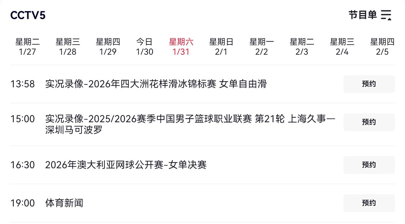 The detailed CCTV-5 live broadcast schedule is provided in the image below.