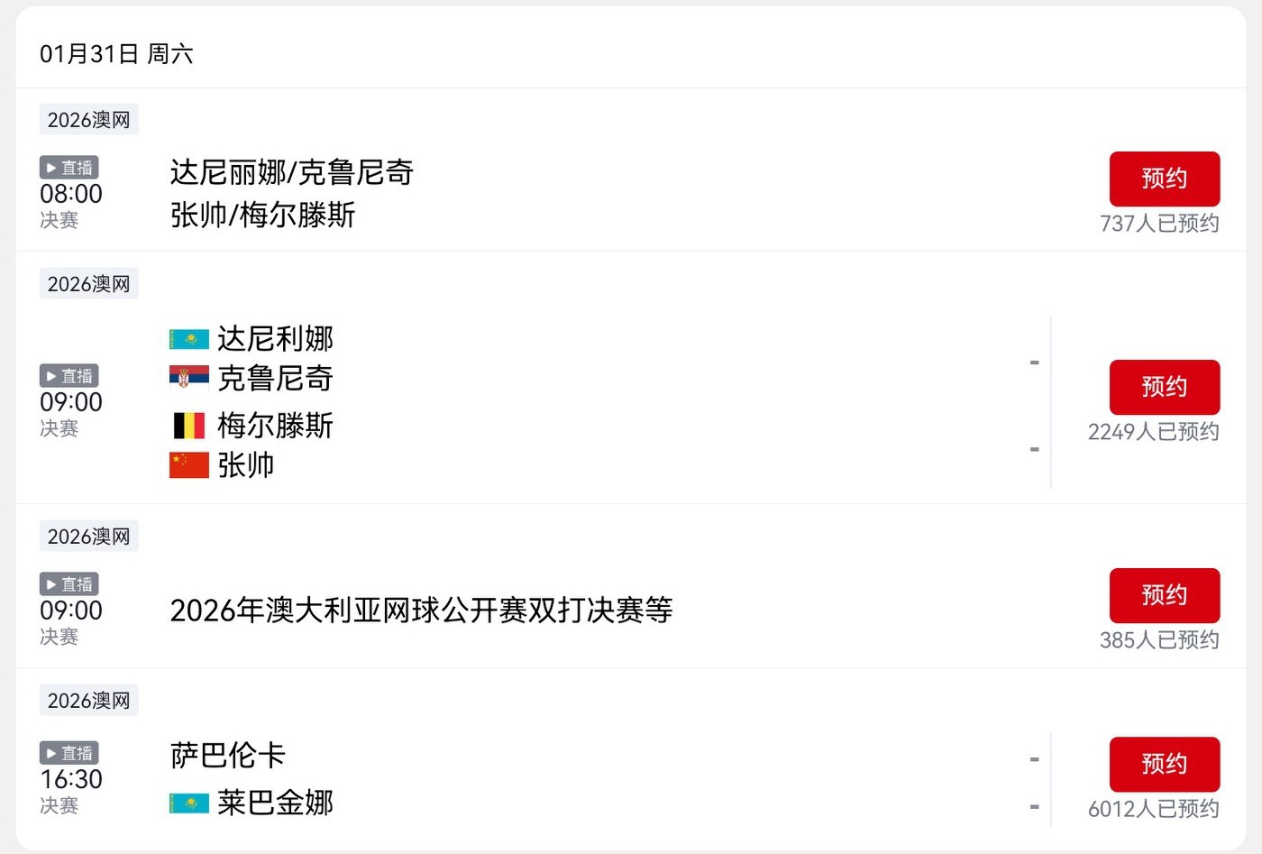 Tomorrow’s Australian Open matches (January 31, 2026) will see Zhang Shuai and Sabalenka competing, with live coverage on CCTV-5.