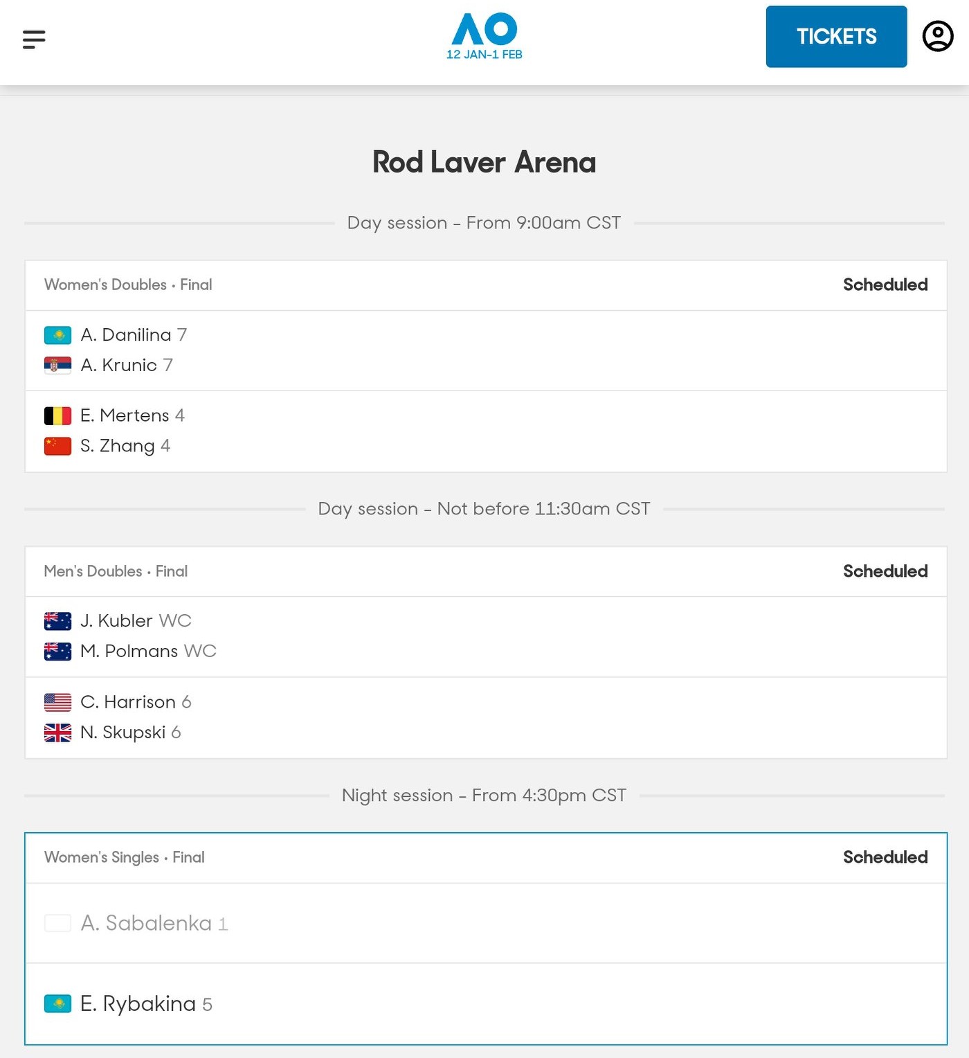 The Australian Open organizers have released the schedule for the women's singles final, which will take place at 4:30 PM today, as detailed in the image below.