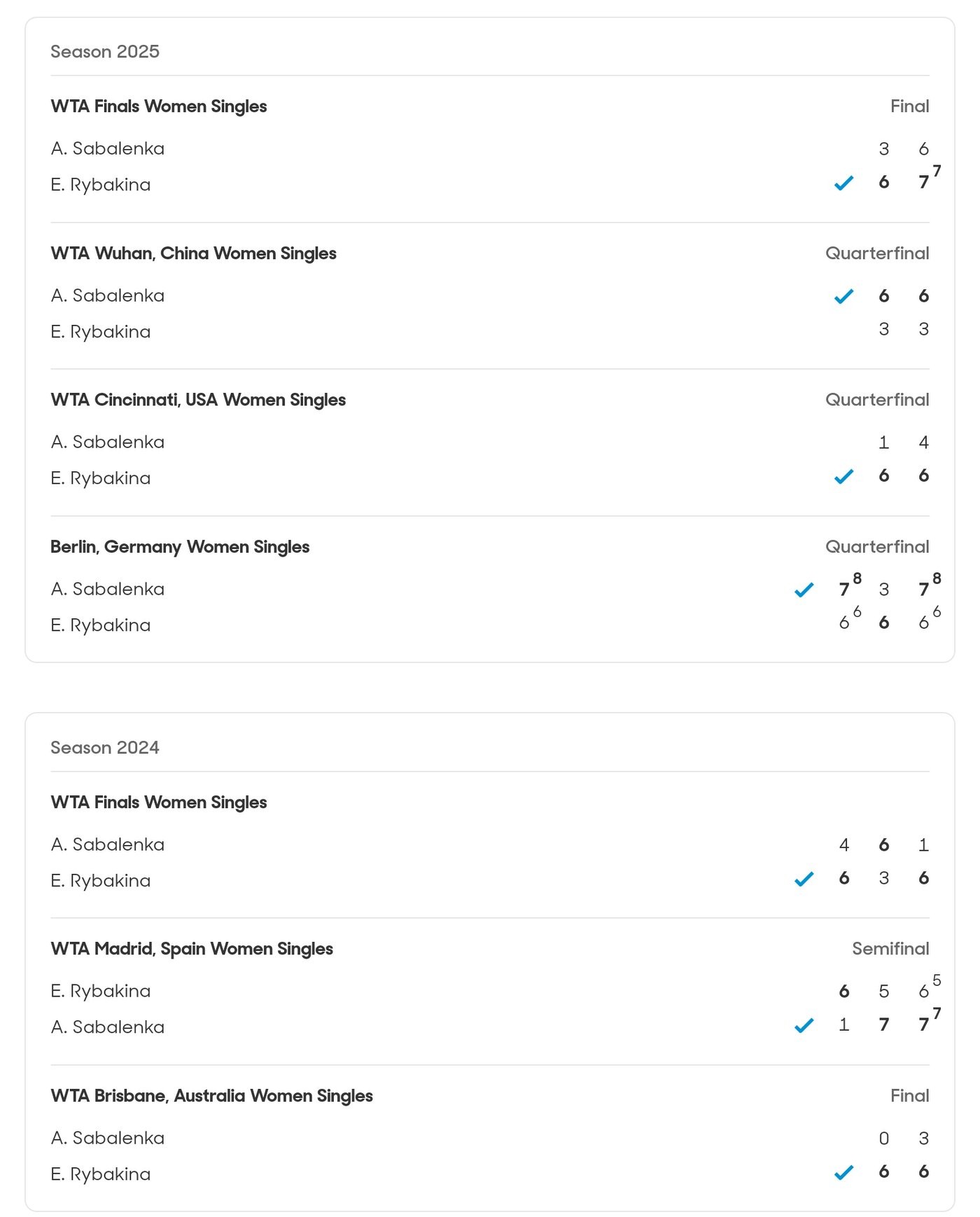 In their last seven encounters, Sabalenka trails Rybakina 3-4, as shown in the image below. Sabalenka is undoubtedly strong, but Rybakina is currently in outstanding form. My personal prediction is that Rybakina will win 2-0 or 2-1, claiming her first Australian Open Women's Singles title. What do you think?