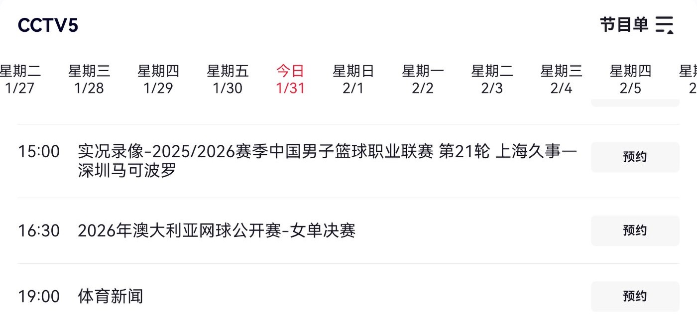 Today's schedule for the Australian Open Women's Singles final (2026.1.31) features Sabalenka vs. Rybakina, live on CCTV-5.