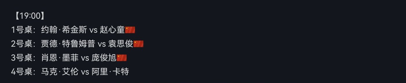 Tonight’s schedule details are shown in the image below. Zhao Xintong, Yuan Sijun, and Pang Junxu will compete. Huya will broadcast the event live, and we hope they win and advance to the next round.