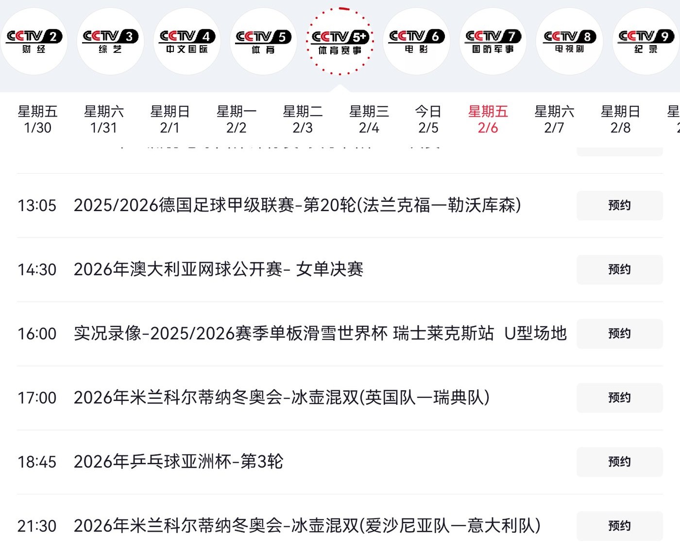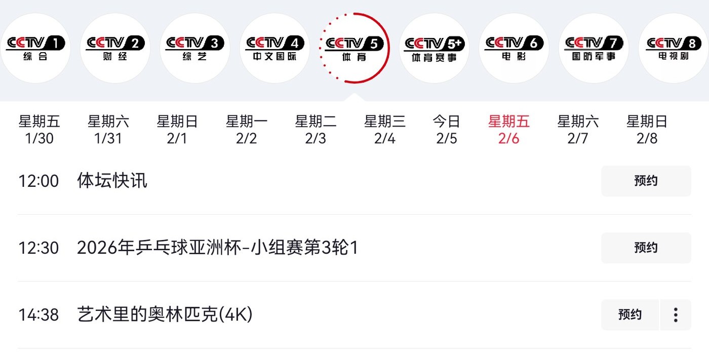 The broadcast schedule for CCTV-5 and the CCTV Video app is detailed in the image below.