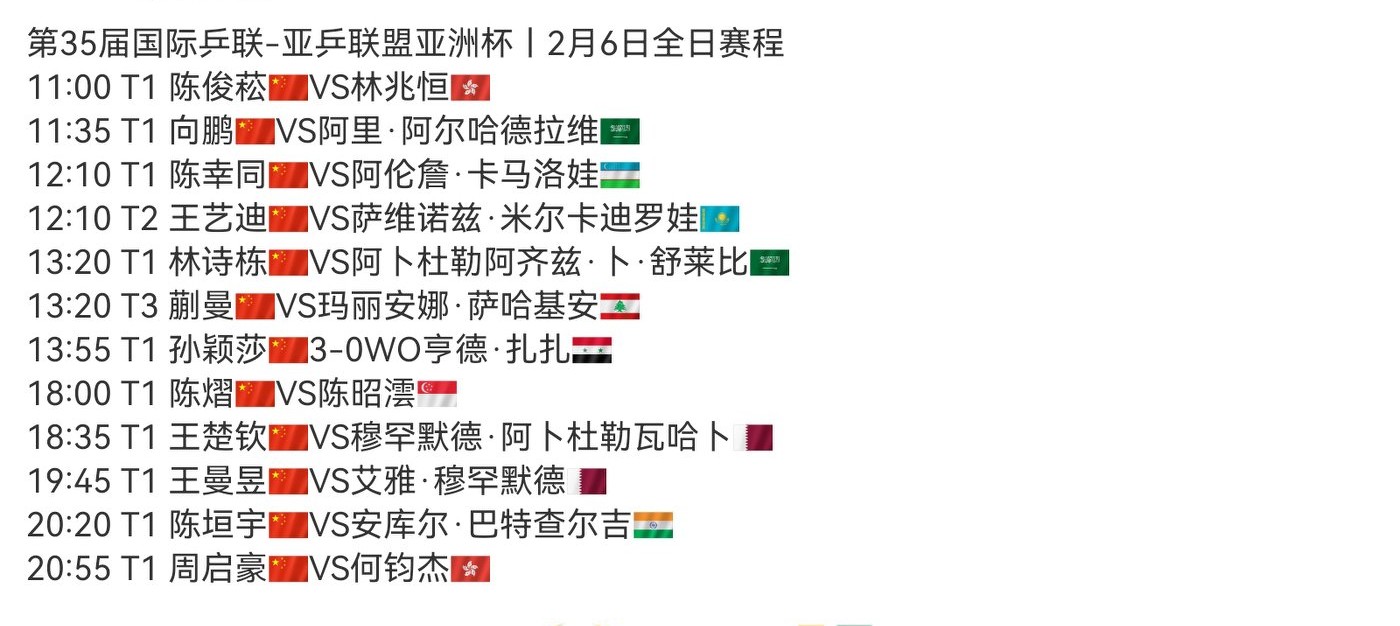 The Table Tennis Asia Cup schedule for tomorrow (2026.2.6) features 12 players including Sun Yingsha, Wang Manyu, Wang Chuqin, and Lin Shidong, with live broadcasts on CCTV-5 and the CCTV Video app.