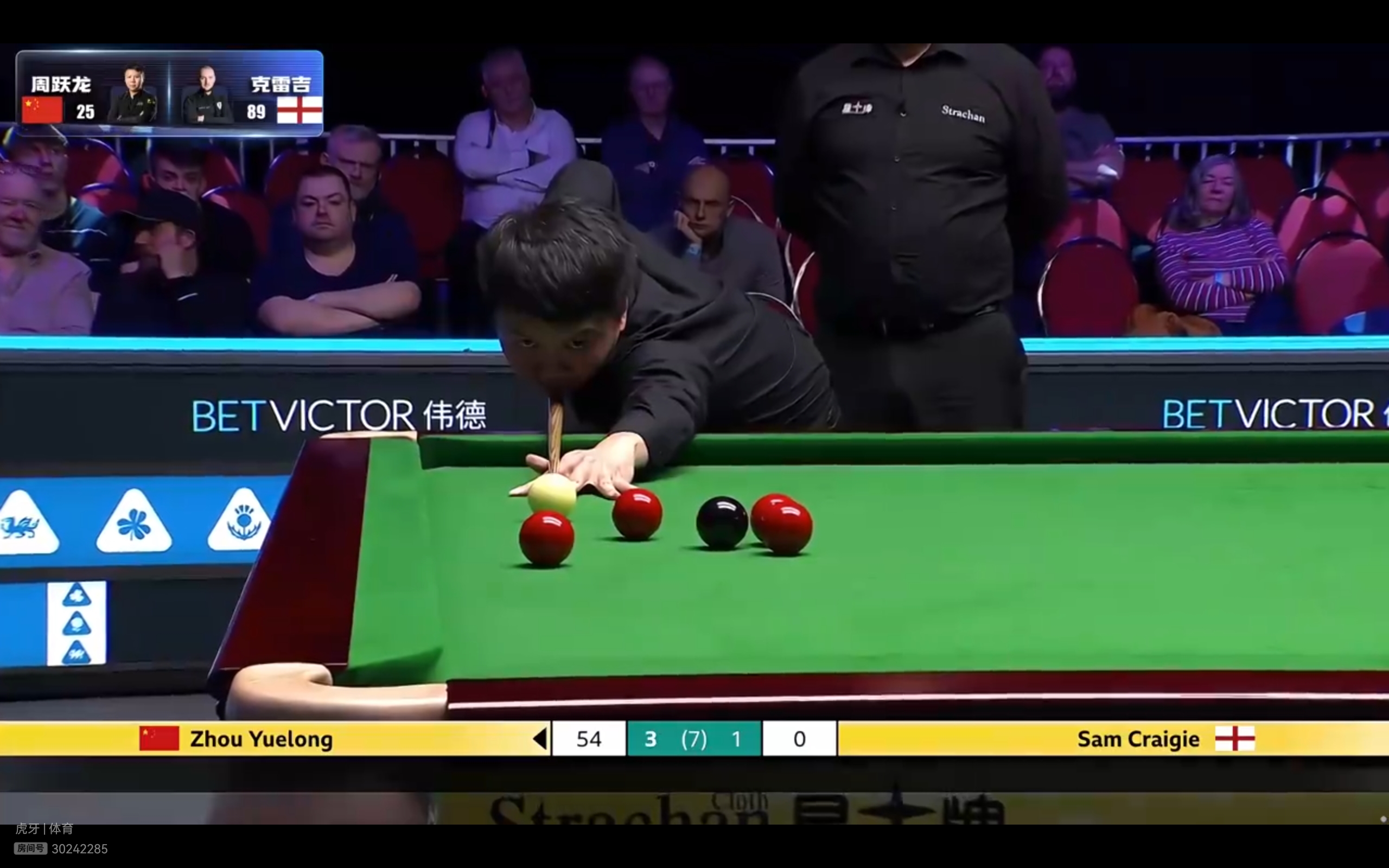 This match follows a best-of-seven frames format. Zhou Yuelong leads Craigie 3-1, and they are currently playing the fifth frame, with Zhou Yuelong ahead 54-0 in points.