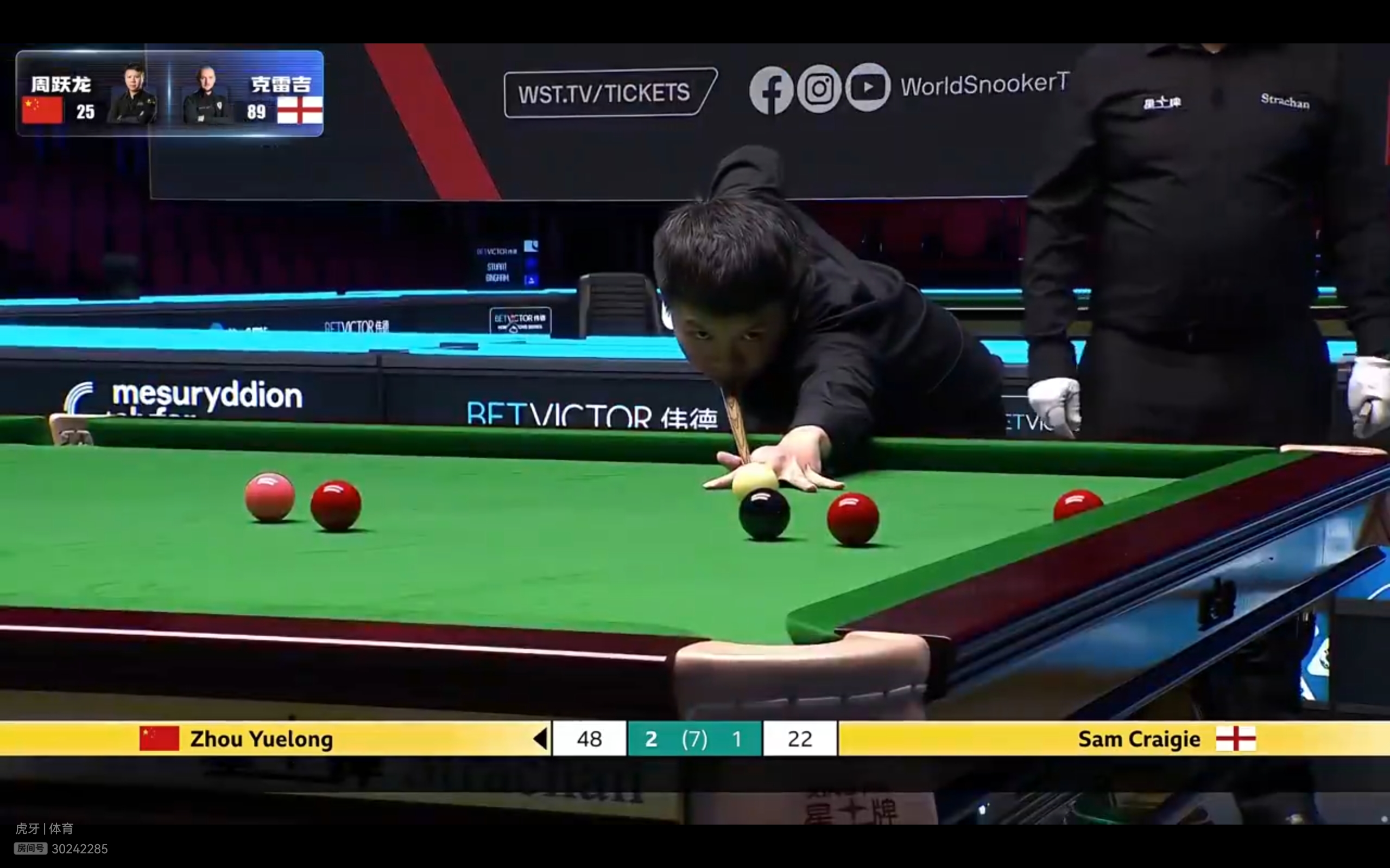 The Huya streaming platform is broadcasting the Snooker Welsh Open 1/8 final match between Zhou Yuelong and Craigie.
