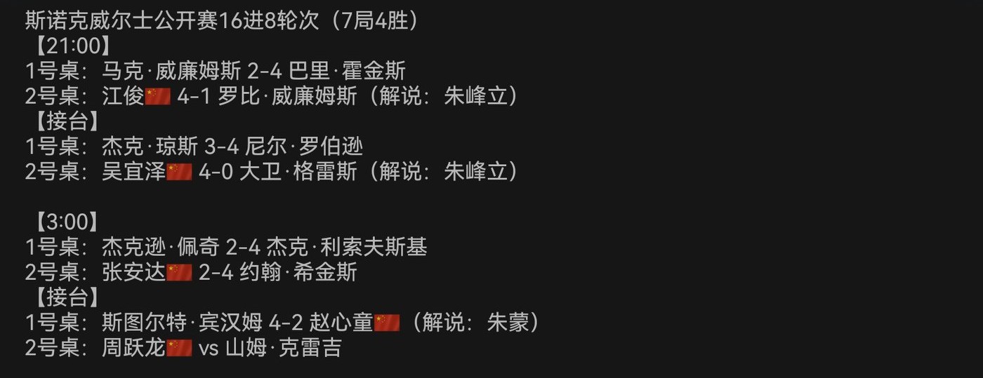 Zhou Yuelong's match against Sam Craigie is currently live. Based on the performance seen so far, I personally believe Zhou Yuelong will win 4-2 or 4-3 to advance to the quarter-finals.