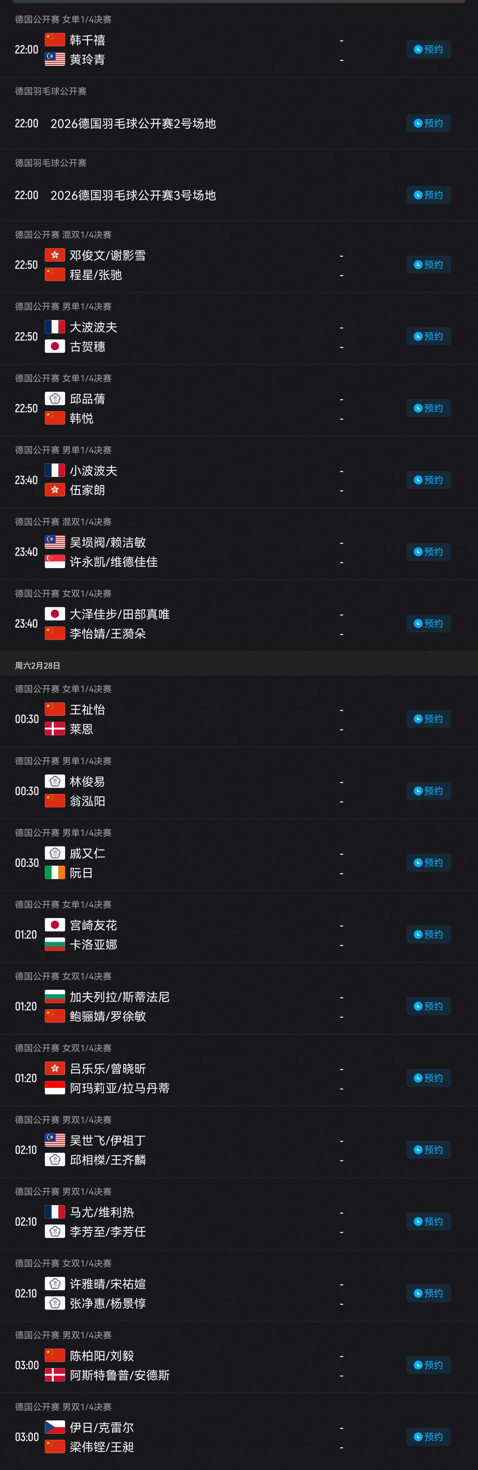 Badminton German Open schedule today (2026.2.27): Weng Hongyang, Wang Zhiyi, the Liang/Wang pair, and others compete in nine matches, live on Youku Sports Channel.