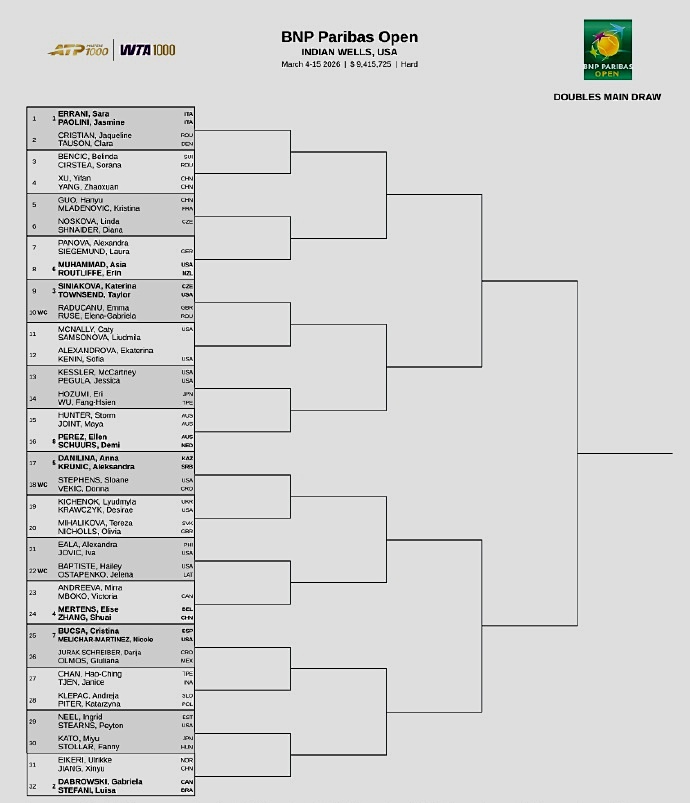 Additionally, in the WTA1000 Indian Wells doubles draw released yesterday, five Chinese players are competing. Their first-round matchups are as follows: Zhang Shuai/Elise Mertens vs. Erika Andreeva/Mirra Andreeva, Xu Yifan/Yang Zhaoxuan vs. Belinda Bencic/Sorana Cîrstea, Guo Hanyu/Kristina Mladenovic vs. Linda Nosková/Diana Shnaider, Jiang Xinyu/Ena Koike vs. Gabriela Dabrowski/Erin Routliffe.