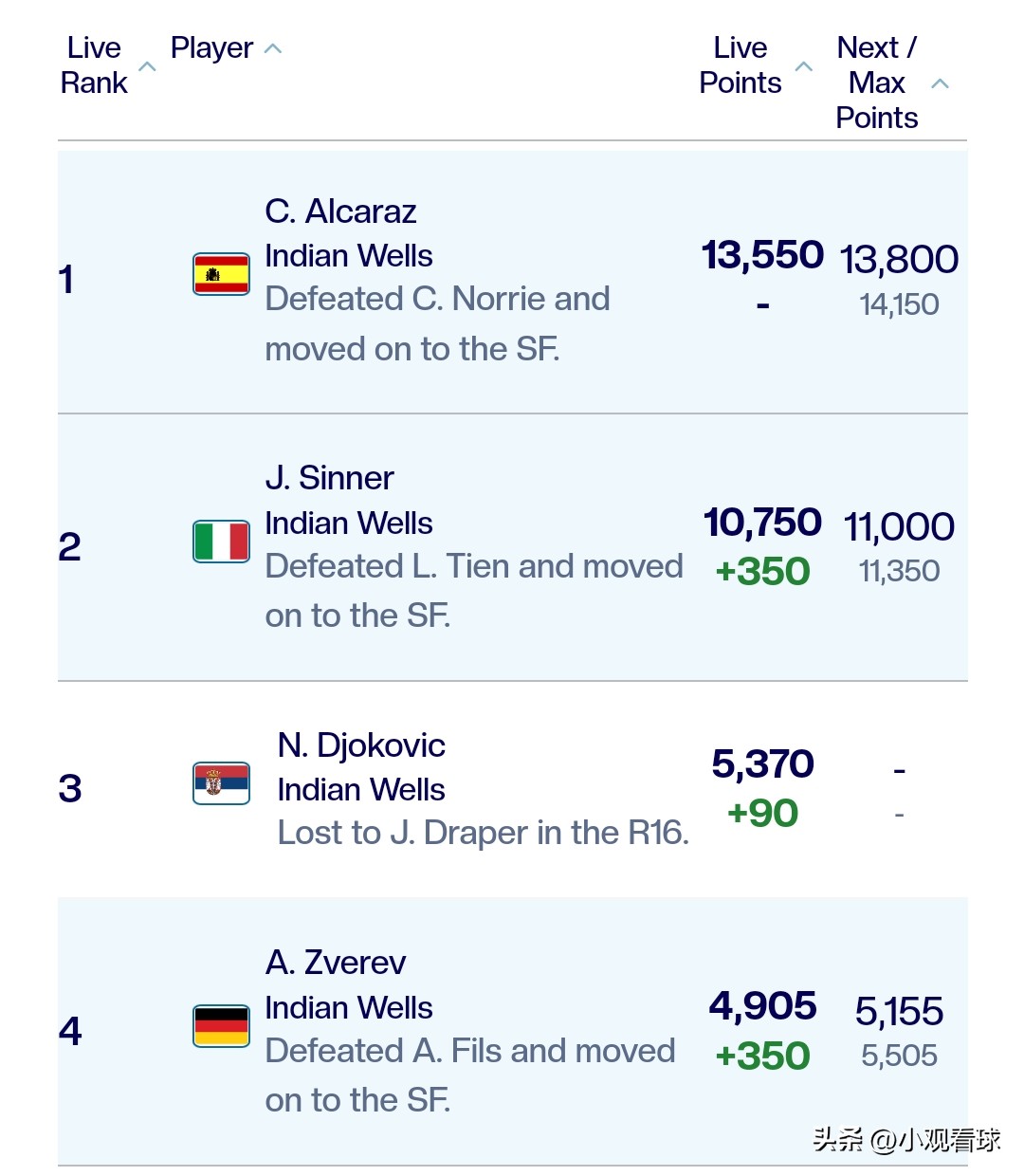 IfZverevmakes it to the final, he will still rank behind Djokovic (5370 points) with 5155 points. If he ultimately wins the championship, he will surpass Djokovic with 5505 points to rank third. However, he needs to defeat Sinner in the semifinals and then beat Alcaraz/Medvedev in the final. This is nearly an impossible task. Of course, if Zverev somehow accomplishes this, it wouldn't just merit a small commendation—it would shake the tennis world!