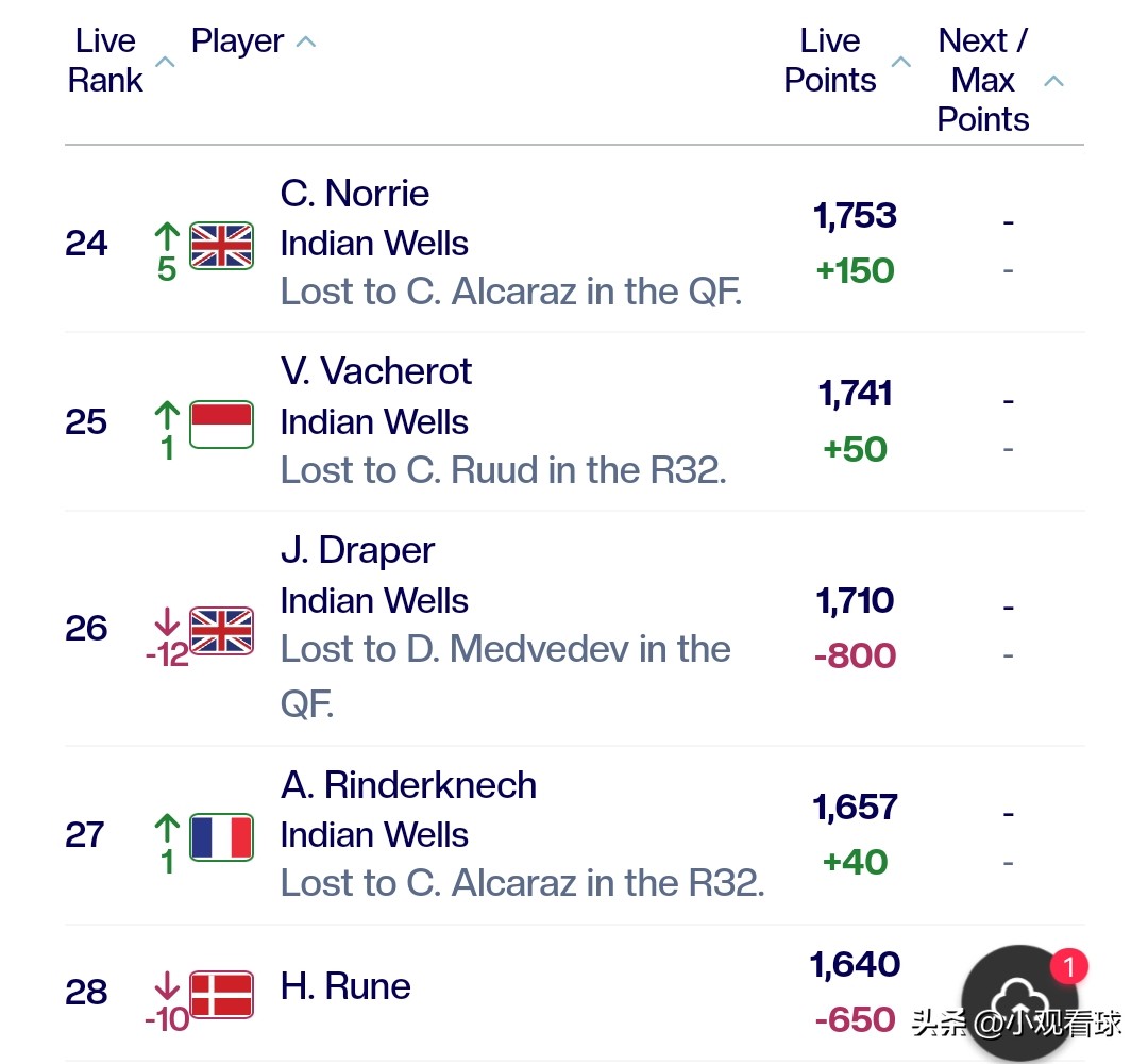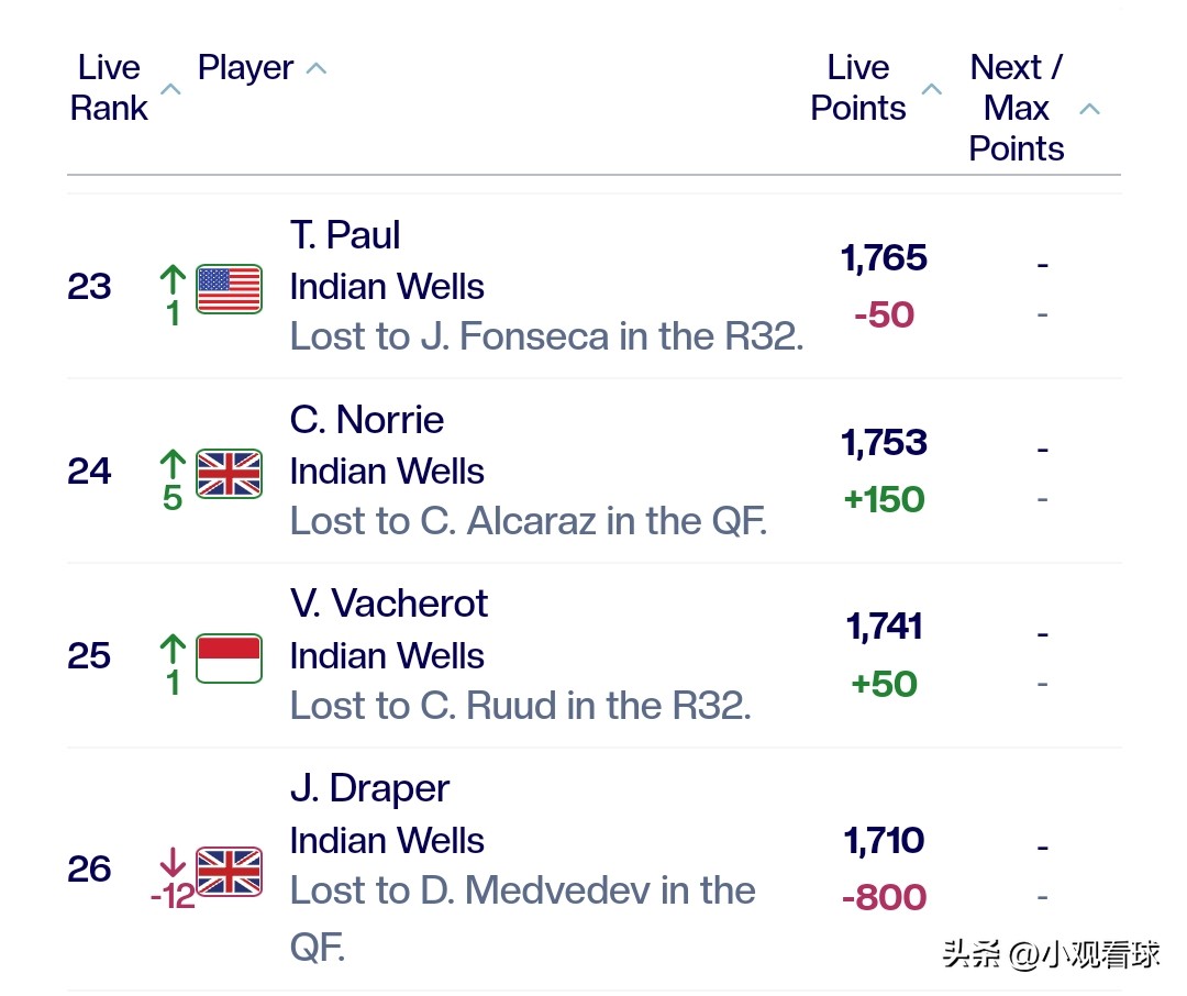 Additionally, Tsitsipas's ranking continues to decline, now at 50th; Hurkacz ranks 73rd, Dimitrov ranks 44th. More regrettable is Shapovalov, who lost to Sinner in the third round, failing to break through in ranking, remaining at 38th. He still cannot secure a seeded position for next week's Miami.