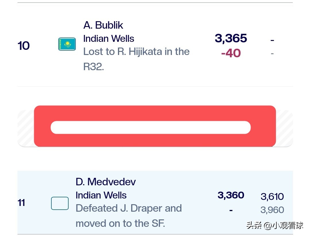 Medvedevcurrently ranks 11th with 3360 points, only 5 points behindBublikwho is in tenth place. It shows that returning to the Top 10 is no longer an insurmountable gap.