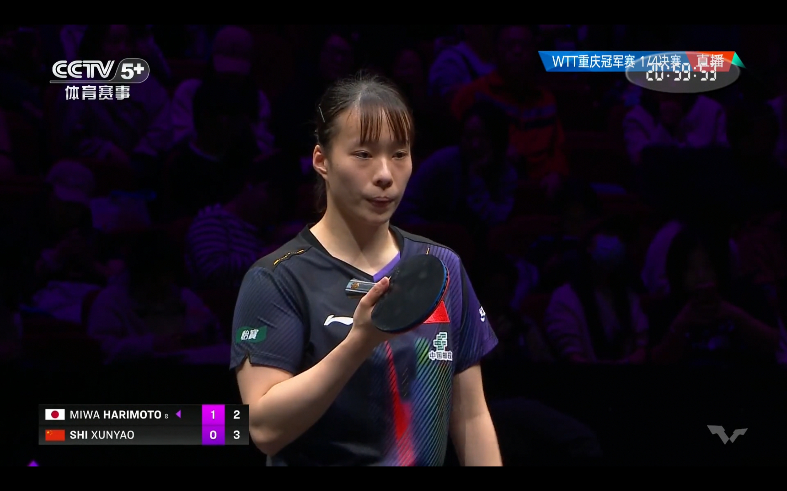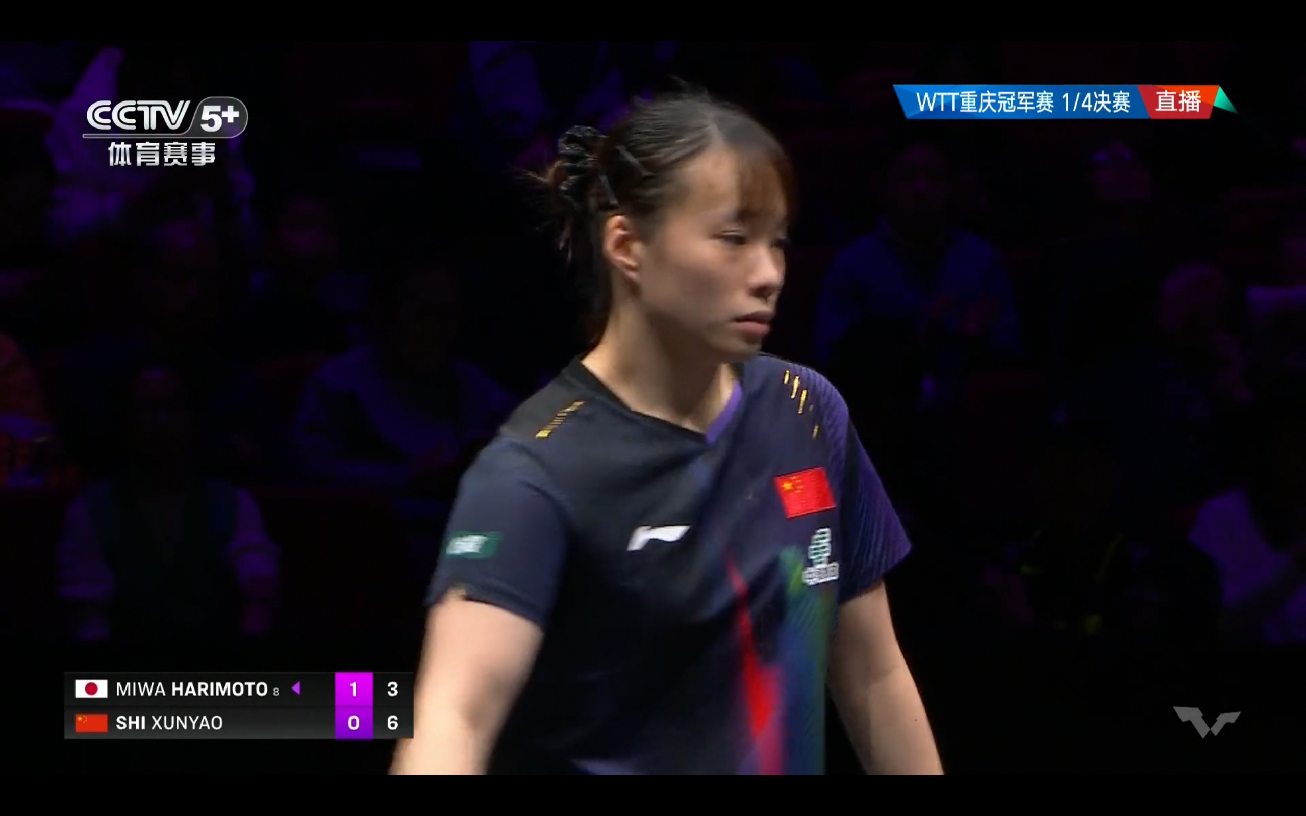 CCTV-5+ channel is live broadcasting the WTT Chongqing Championship table tennis match between Shi Xunyao and Harimoto Miwa.