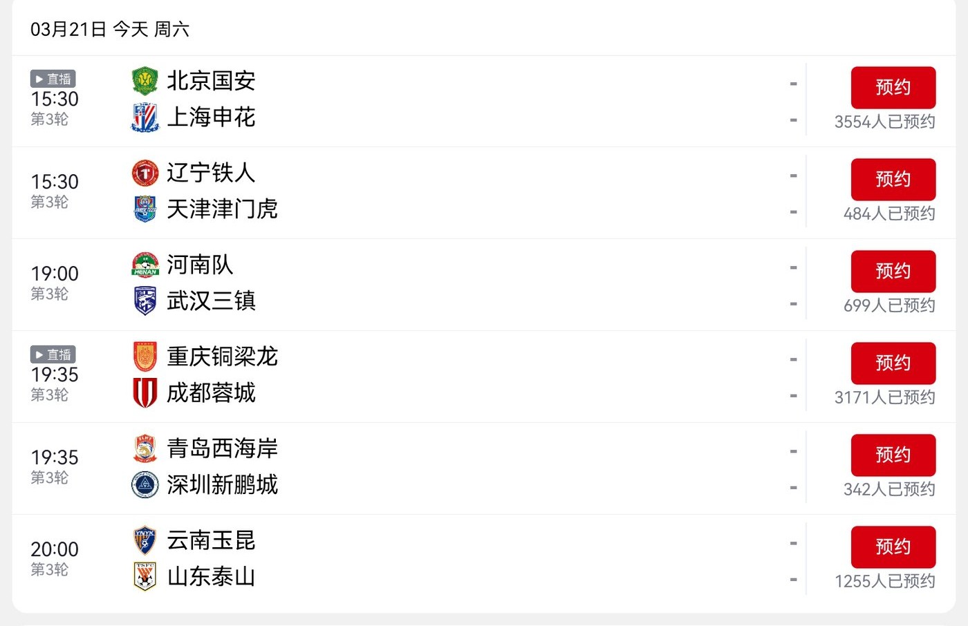 According to the officially released schedule, six matches are scheduled for the third round of the CSL today, details as shown in the image below.