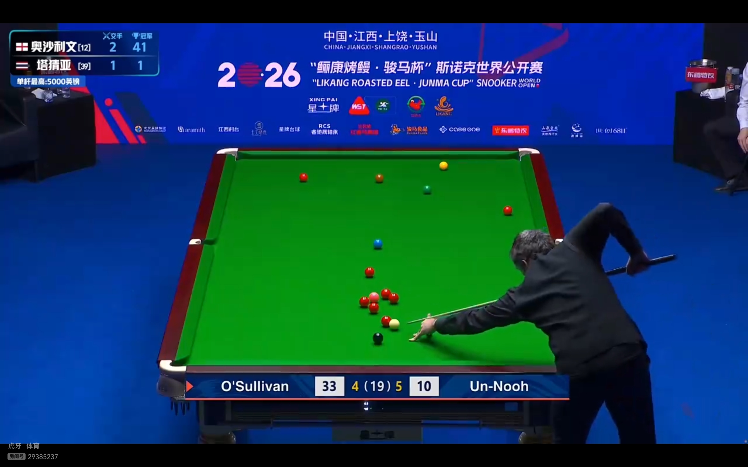 The CCTV Video and Huya live streaming platforms are broadcasting the second stage of the Snooker World Open final match between O'Sullivan and Thachai.